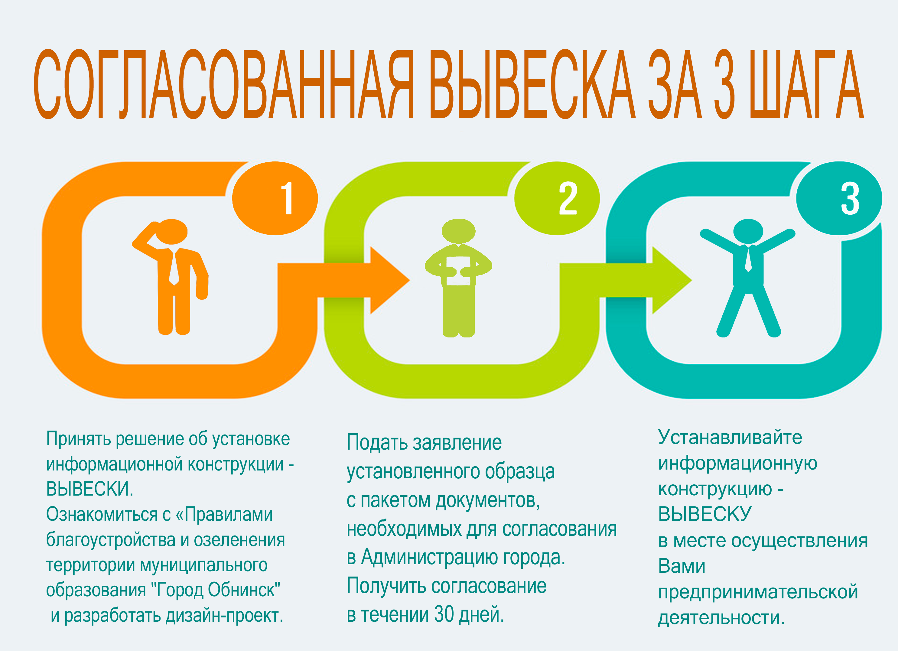 Уважаемые жители и гости города Обнинска, сообщаем Вам, что Администрация города в соответствии с «Правилами благоустройства и озеленения территории муниципального образования "Города Обнинск" пункт 7, осуществляет приём по вопросам выдачи разрешений на установку и согласование внешнего вида информационных конструкций (вывесок), размещенных на фасадах нежилых помещений и жилых многоквартирных домов.
