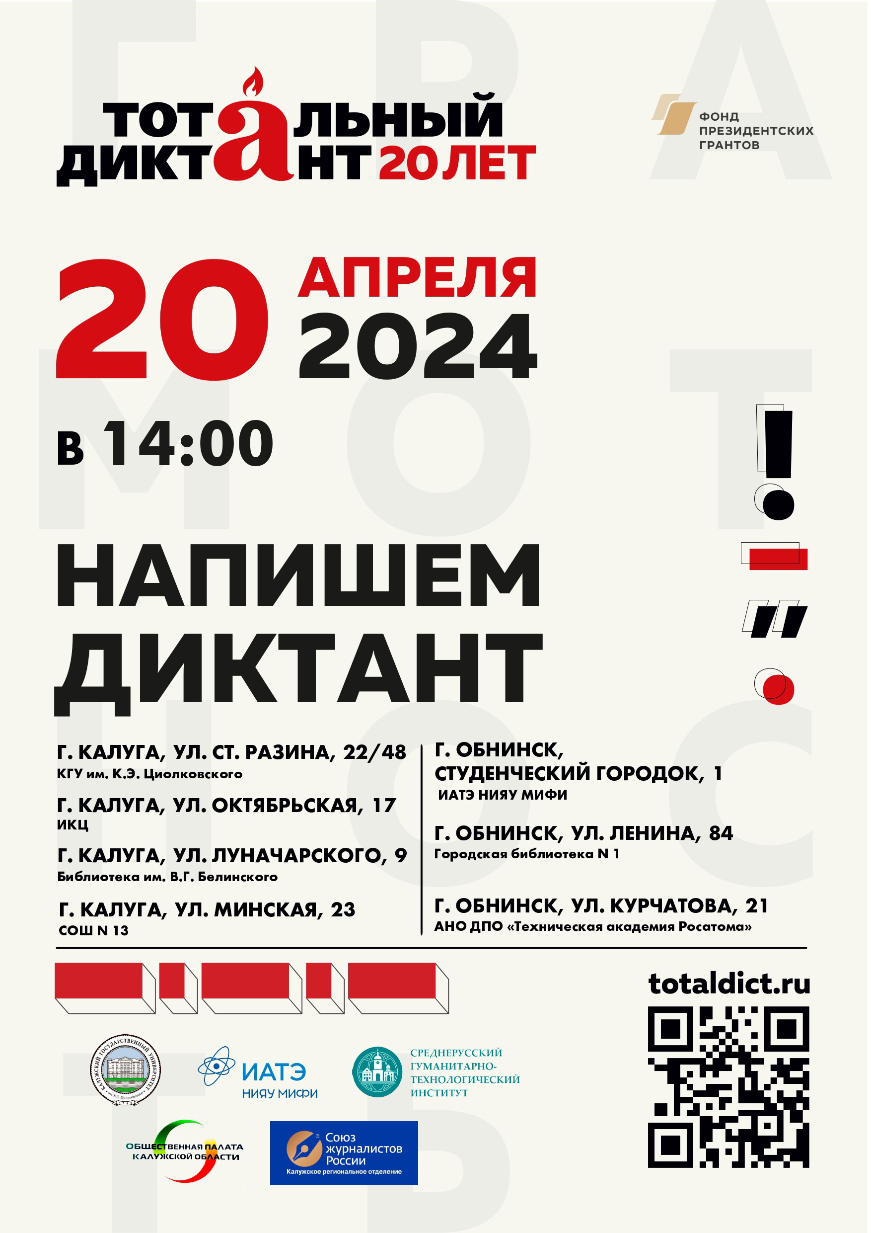 В Обнинске в этом году Тотальный диктант пройдет на трёх площадках. Регистрация уже открыта на официальном сайте: https://totaldict.ru/kaluga/#