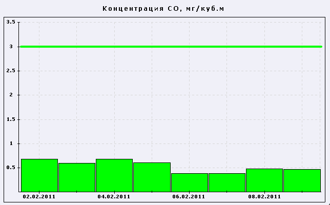 В рамках подписанного в декабре 2010 года соглашения о сотрудничестве в сфере экологического мониторинга окружающей среды между научно-производственным объединением «Тайфун» и Администрацией города публикуются данные мониторинга состояния атмосферного воздуха в городе за период с 02.02.11 г по 09.02.11г. по трем параметрам: CO, SO2, NH3.