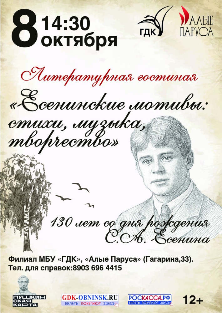 8 октября в 14:30 Городской Дворец Культуры приглашает в литературную гостиную «Есенинские мотивы: стихи, музыка, творчество» (12+).