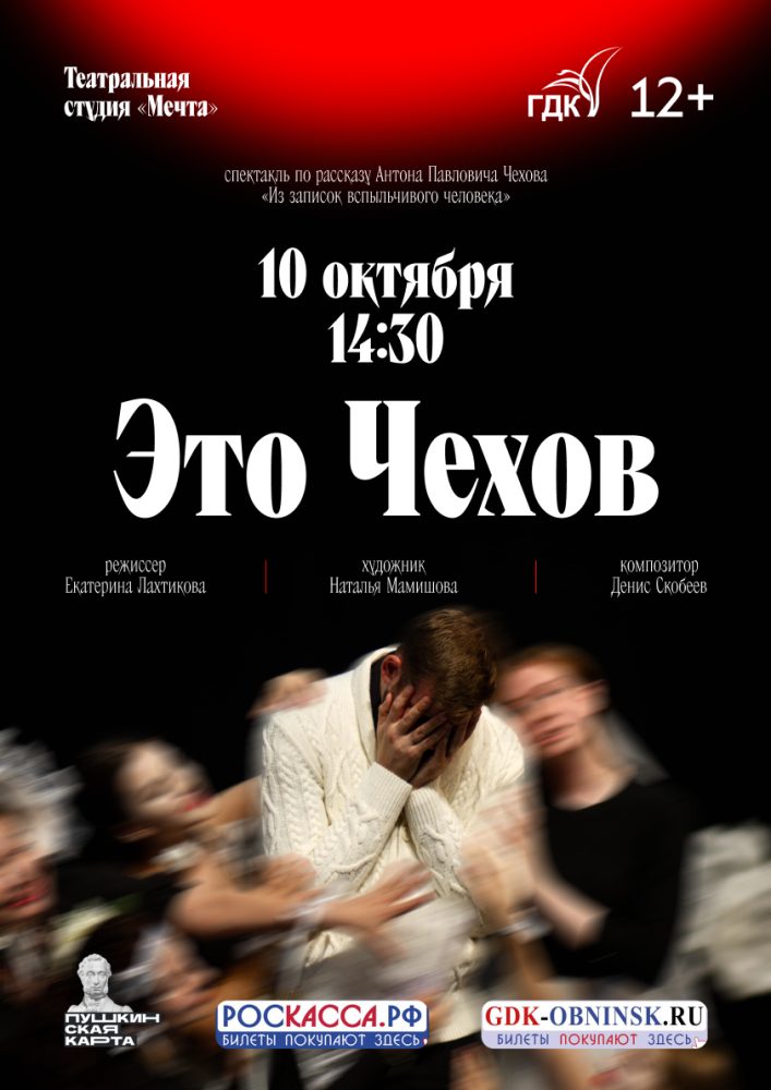 10 октября 2025 года в 14:30 в Городском Дворце Культуры состоится премьера спектакля «Это Чехов», созданного по мотивам рассказа Антона Павловича Чехова «Из записок вспыльчивого человека». Постановка подготовлена театральной студией «Мечта» под руководством режиссера Екатерины Лахтиковой.