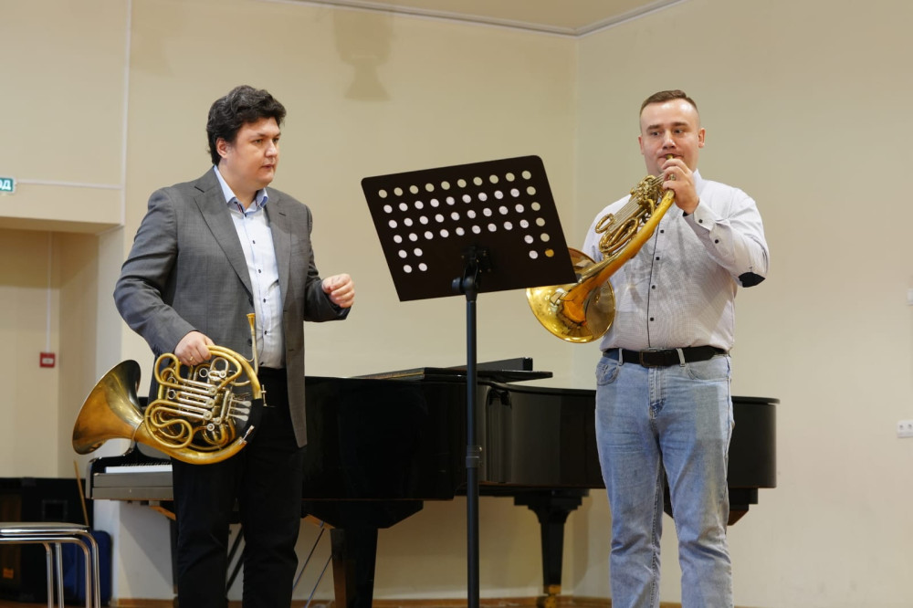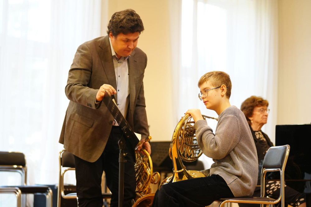 Сергей Коробов, артист группы валторн оркестра, провел мастер-класс по классу валторны. Он нашёл особый подход к каждому юному музыканту. Он сумел успокоить волнение и помочь ребятам раскрыться. Итог — валторны зазвучали мягко и певуче, а мелодии обрели новое дыхание!
