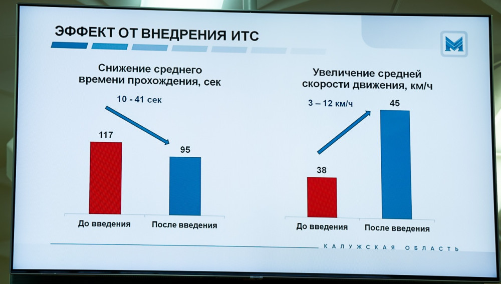 Опытная эксплуатация ИТС на выезде с Правого берега, на четырех участках от Московской площади до выезда из Калуги позволила увеличить среднюю скорость движения автотранспорта до 26 % и уменьшить время в пути в часы пик до 27 %.