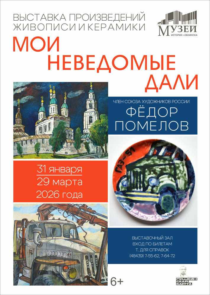 С 31 января по 29 марта в выставочном зале Музея истории города Обнинска будет проходить выставка произведений живописи и керамики Фёдора Помелова «Мои неведомые дали».