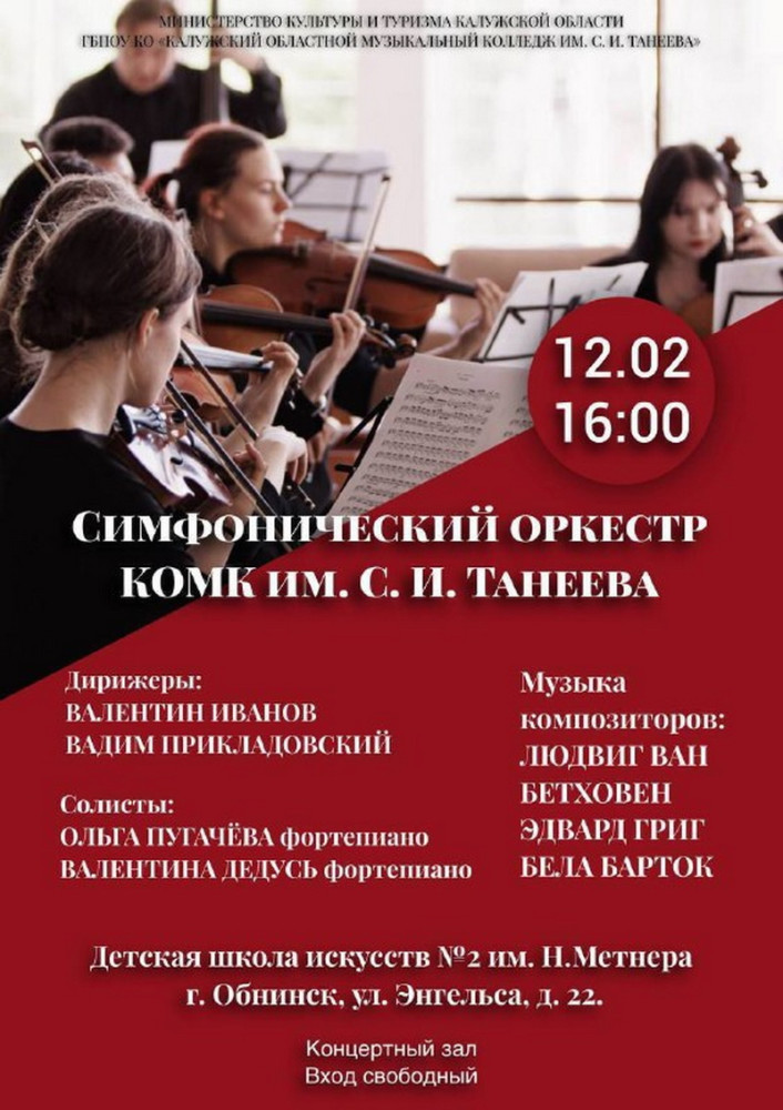 12 февраля в ДШИ №2 им. Н. Метнера (ул. Энгельса, 22) пройдёт концерт симфонического оркестра студентов Калужского областного музыкального колледжа им. С. И. Танеева.