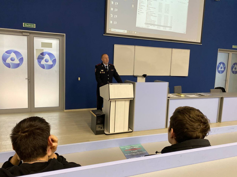 Перед студенами выступил заместитель начальника ОМВД России по городу Обнинску Юрий Хрипунов. Темами беседы по правовому информированию стала профилактика мошеннических действий, терроризм и экстремизм.