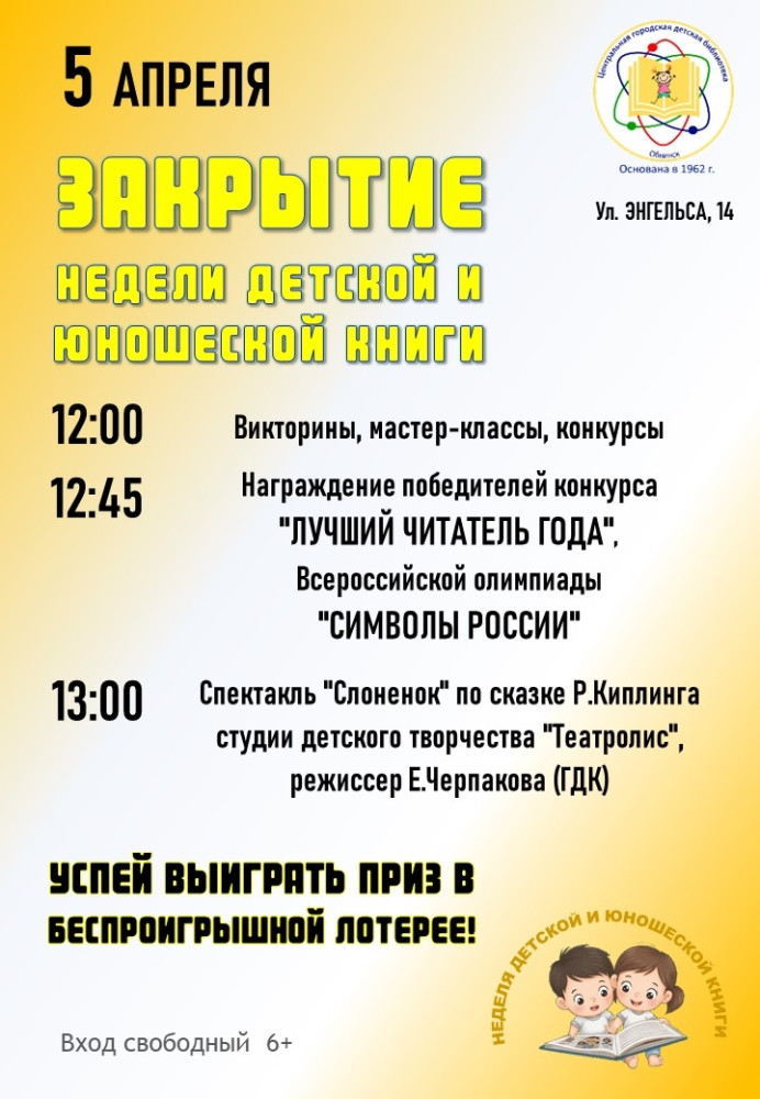 5 апреля в Центральной городской библиотеке города Обнинска (ул. Энгельса, д. 14) состоится торжественное закрытие ежегодной Недели детской и юношеской книги.