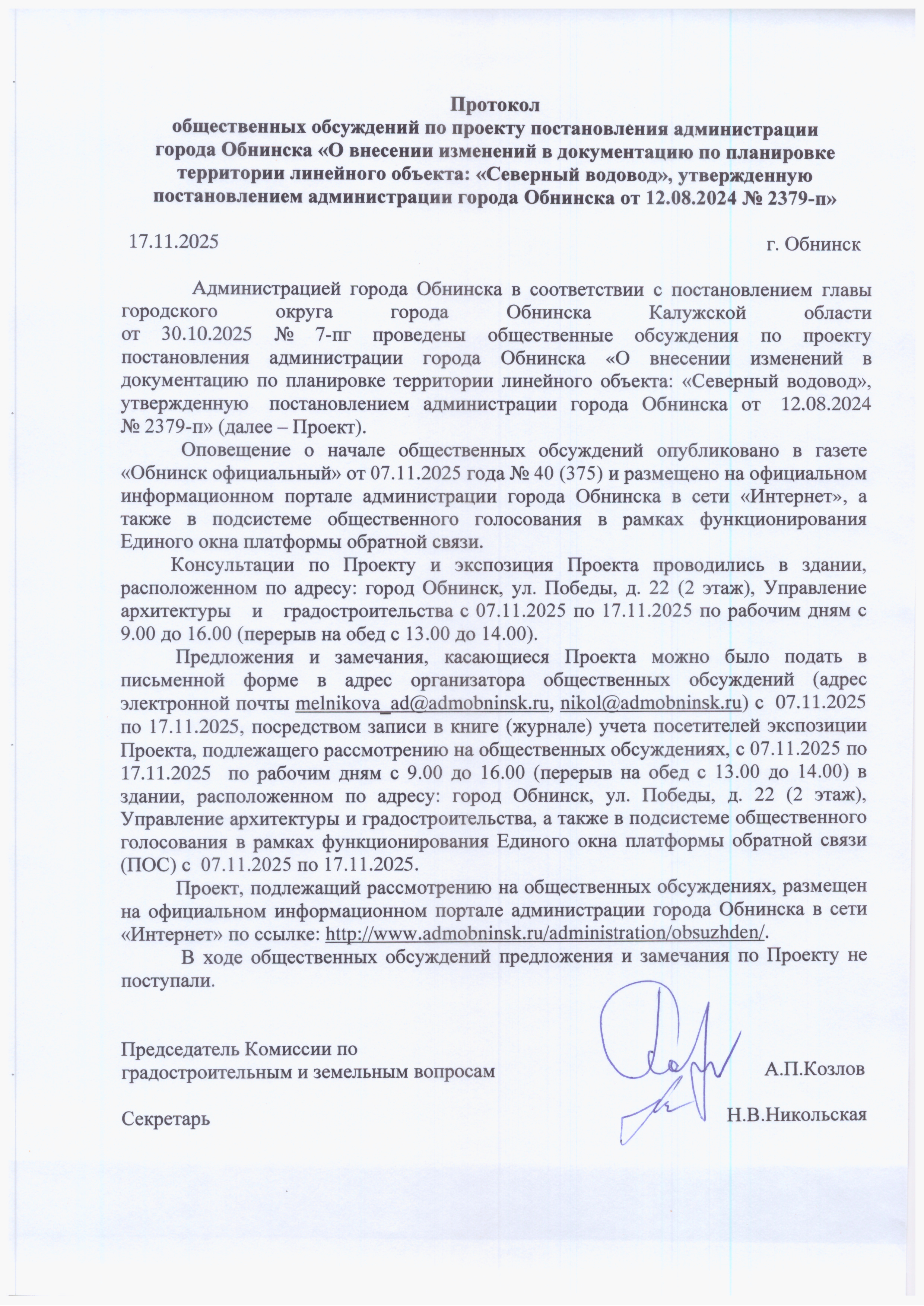 Протокол общественных обсуждений по проекту постановления администрации города Обнинска «О внесении изменений в документацию по планировке территории линейного объекта: «Северный водовод», утвержденную постановлением администрации города Обнинска от 12.08.2024 № 2379-п»