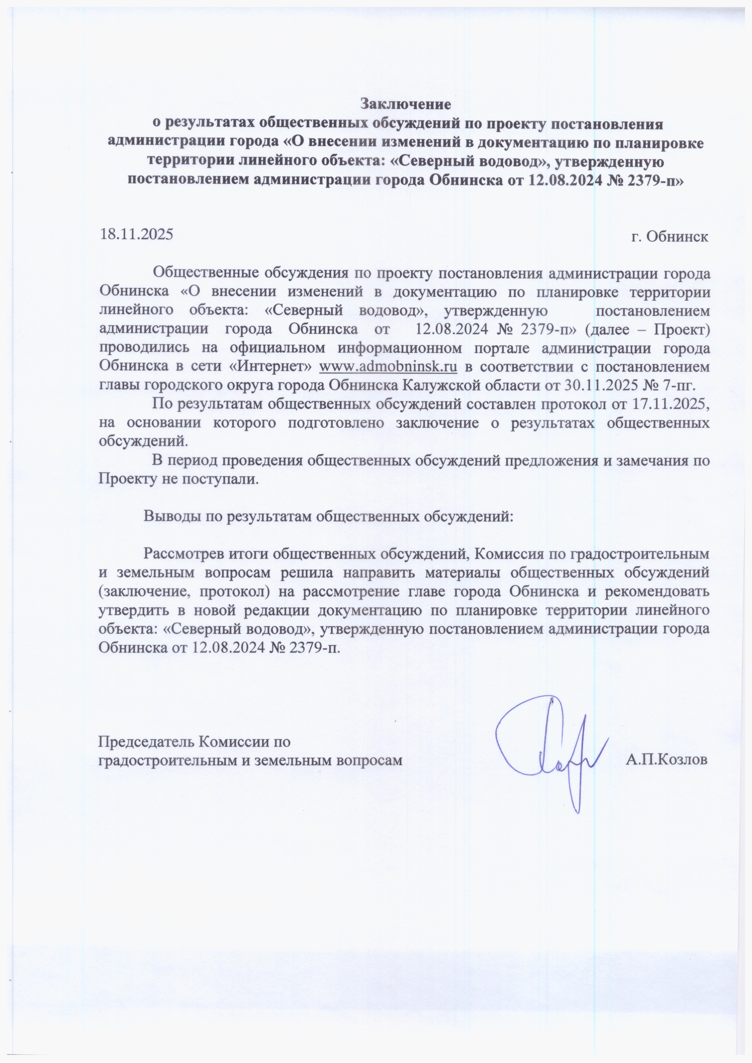 Заключение о результатах общественных обсуждений по проекту постановления администрации города Обнинска «О внесении изменений в документацию по планировке территории линейного объекта: «Северный водовод», утвержденную постановлением администрации города Обнинска от 12.08.2024 № 2379-п»