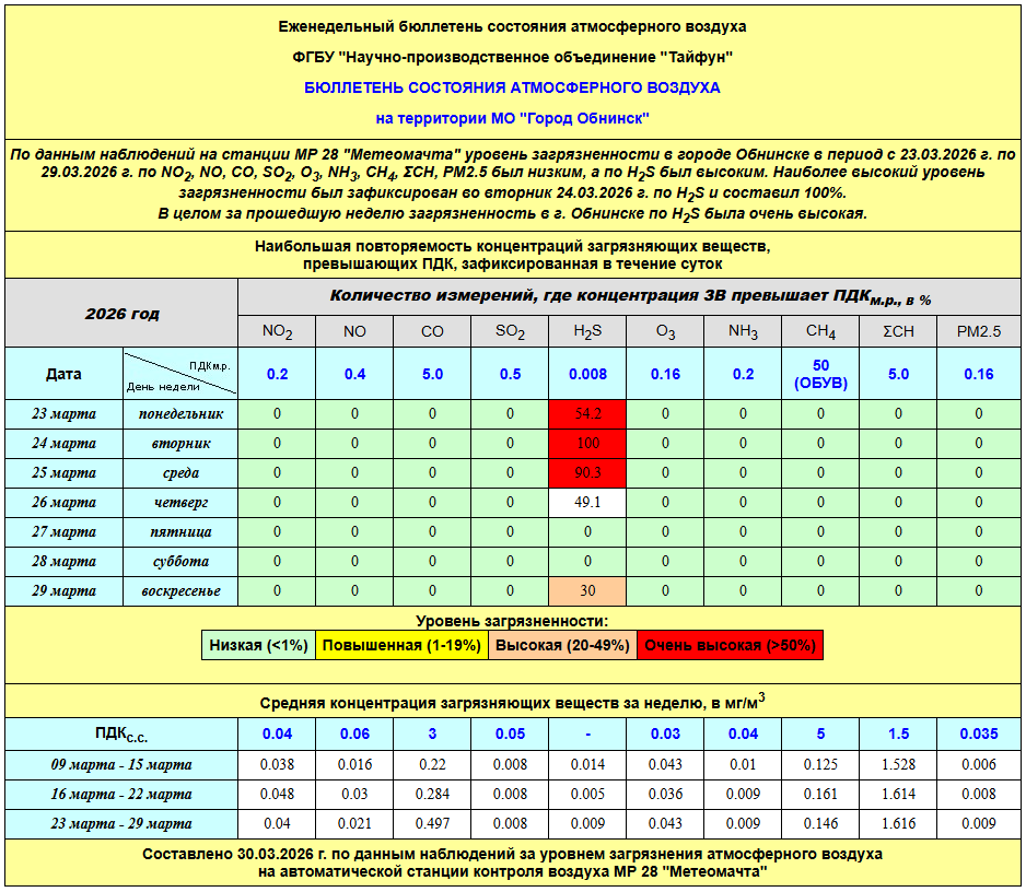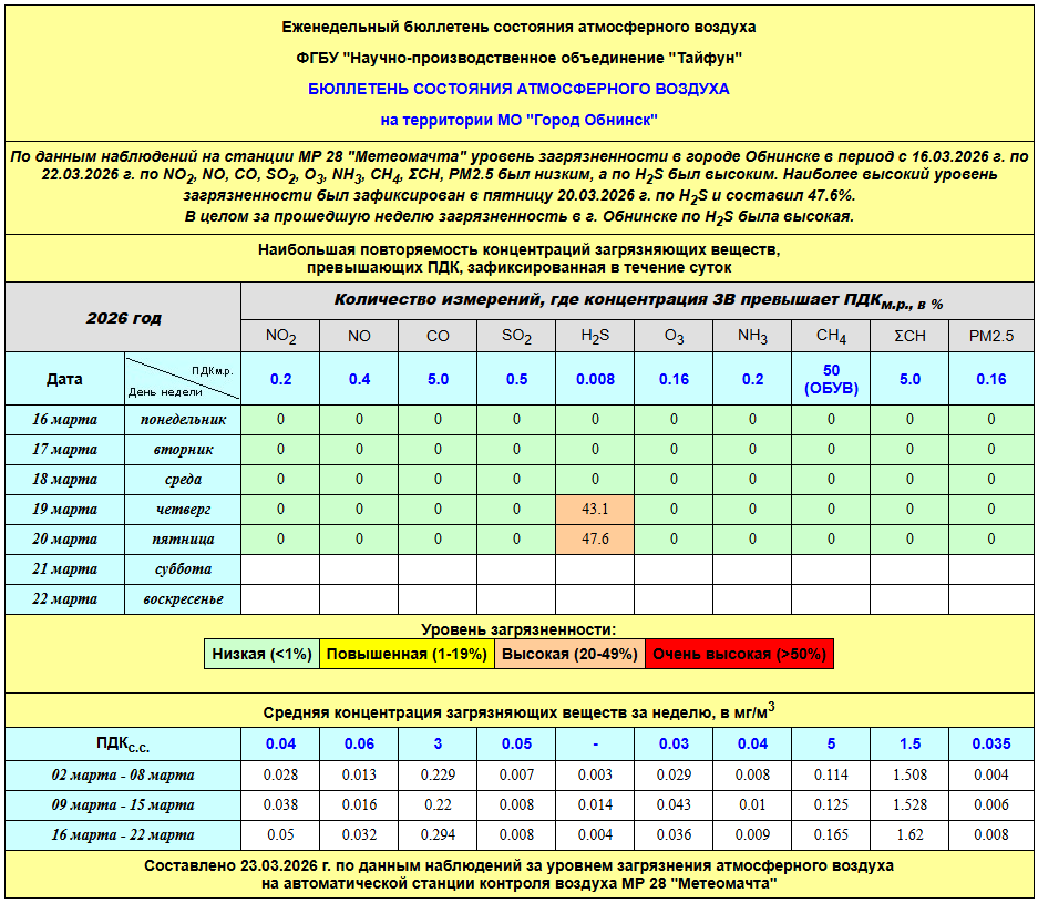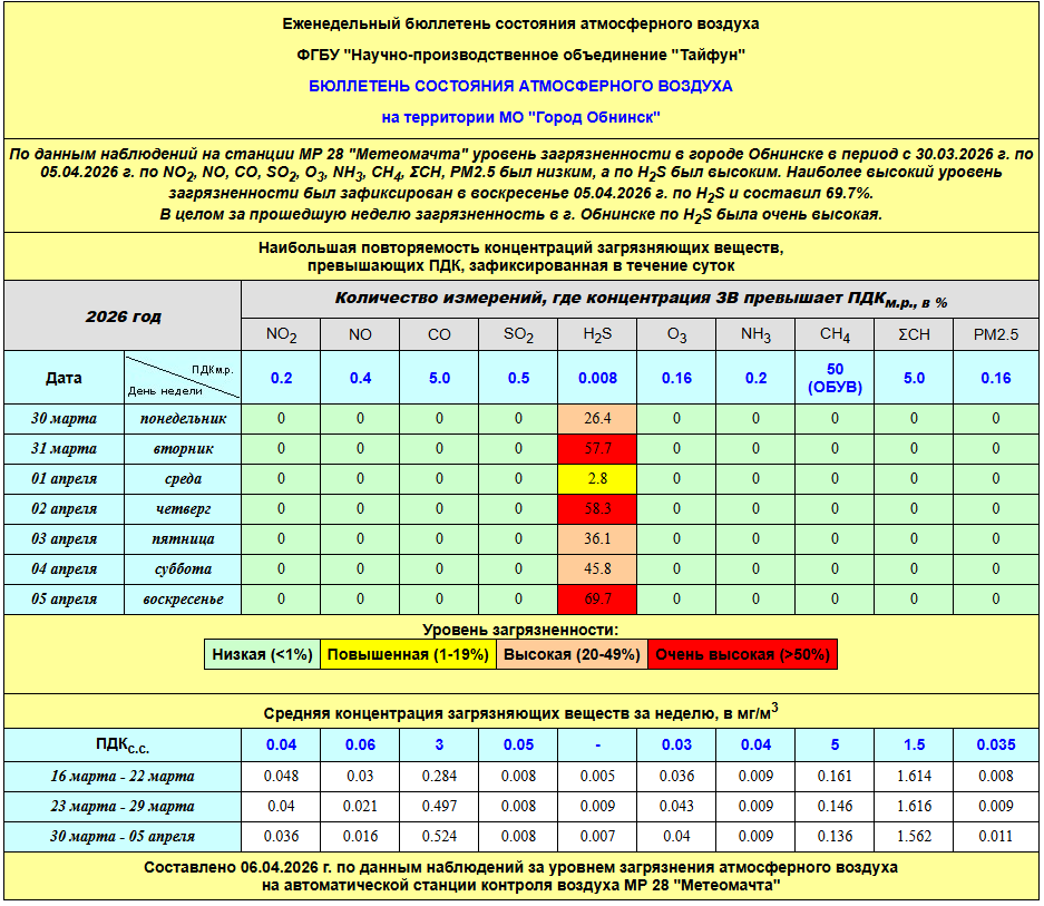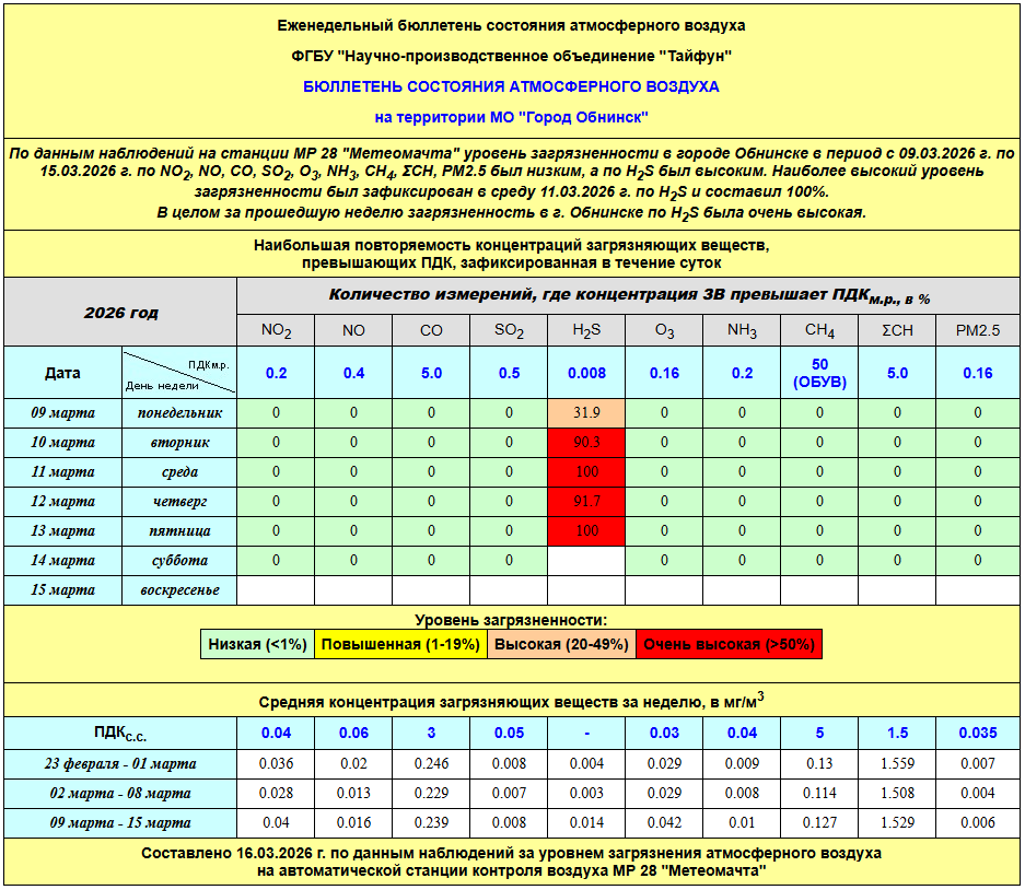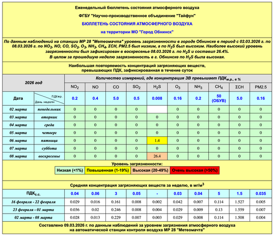 По информации, предоставленной ФГУП НПО «Тайфун», отмеченные в бюллетене состояния атмосферного воздуха на территории МО «Город Обнинск» превышения концентрации по H2S (сероводород) за период с 08.02.-12.02. связаны с некорректной работой прибора. В настоящее время проводятся работы по технической диагностике прибора.
