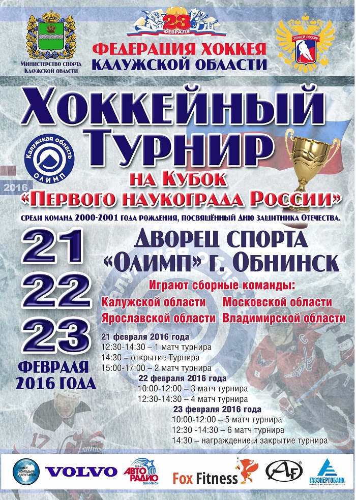 21, 22 и 23 февраля 2016 года Федерация хоккея Калужской области и Дворец спорта «Олимп» приглашают на Хоккейный турнир на Кубок «Первого наукограда России», организованный в честь Дня защитника Отечества.