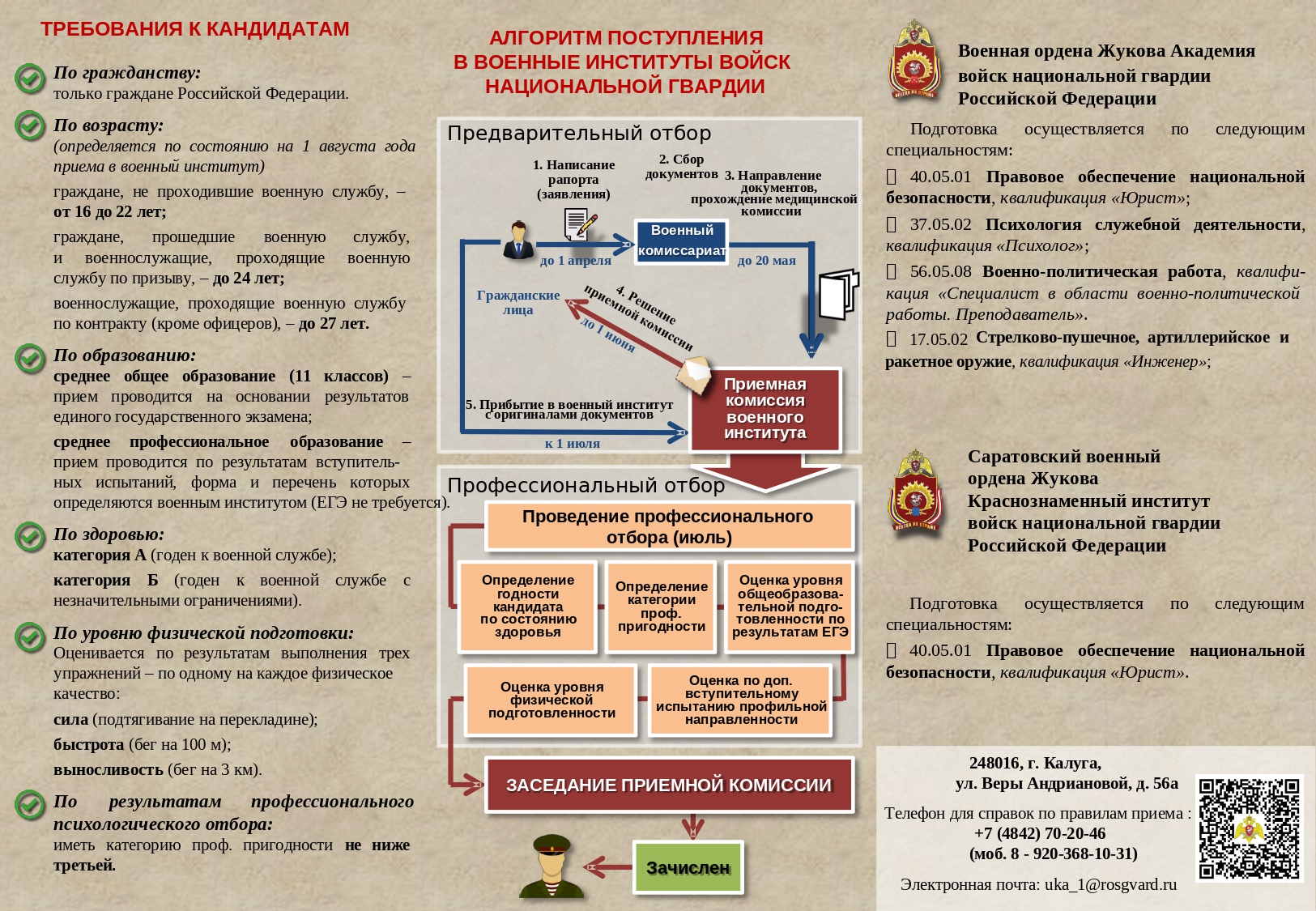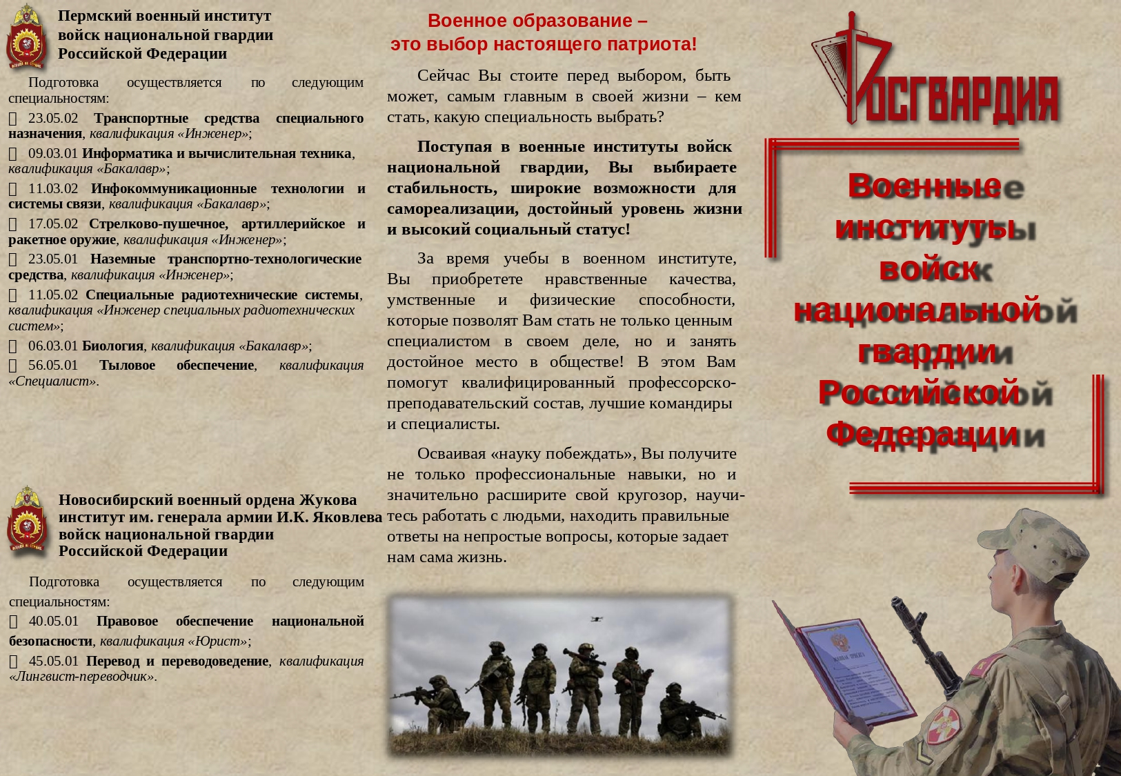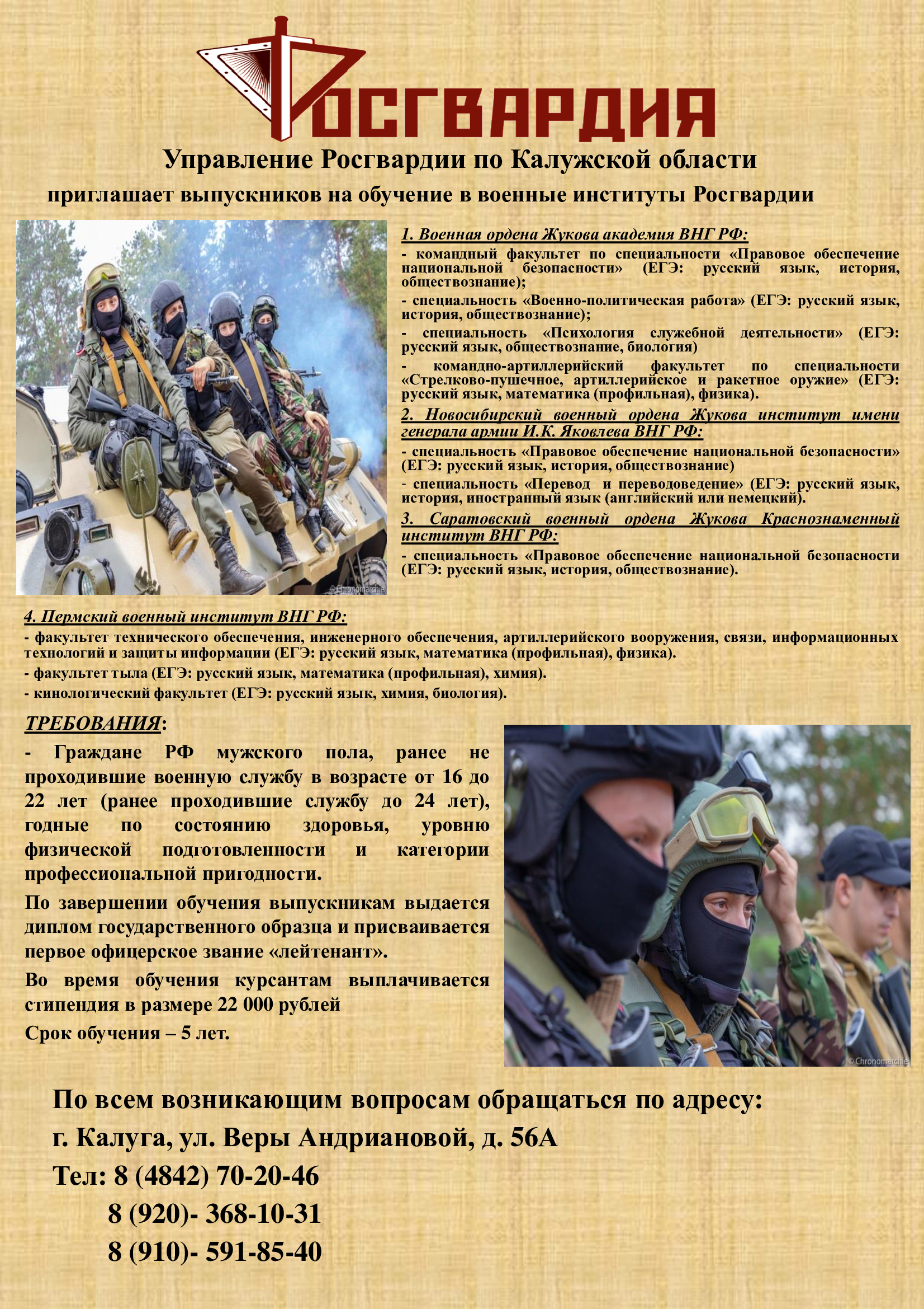 • Управление Росгвардии по Калужской области проводит комплекс организационных и практических мероприятий по комплектованию первых курсов военных образовательных организаций высшего образования