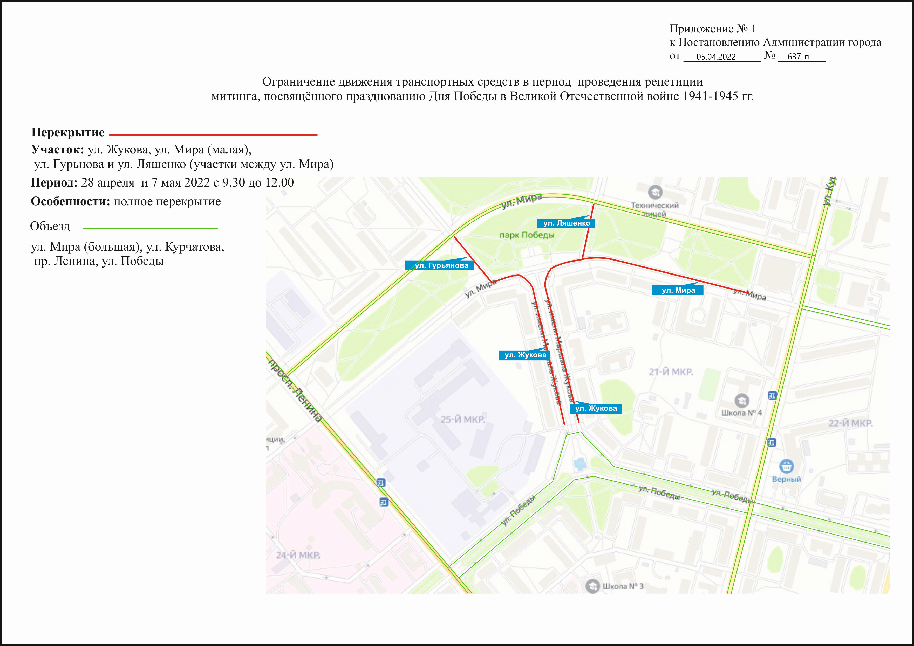- с 7.00 часов до окончания мероприятия на автомобильной дороге по ул. Маршала Жукова, на автомобильной дороге по ул. Мира (Малая), на участке автомобильной дороги по ул. Победы (от пересечения с пр. Ленина до пересечения с ул. Курчатова), на участке автомобильной дороги по ул. Ляшенко (между ул. Мира) до 15.00 часов, на участке автомобильной дороги по ул. Гурьянова (между ул. Мира) до 15.00 часов;