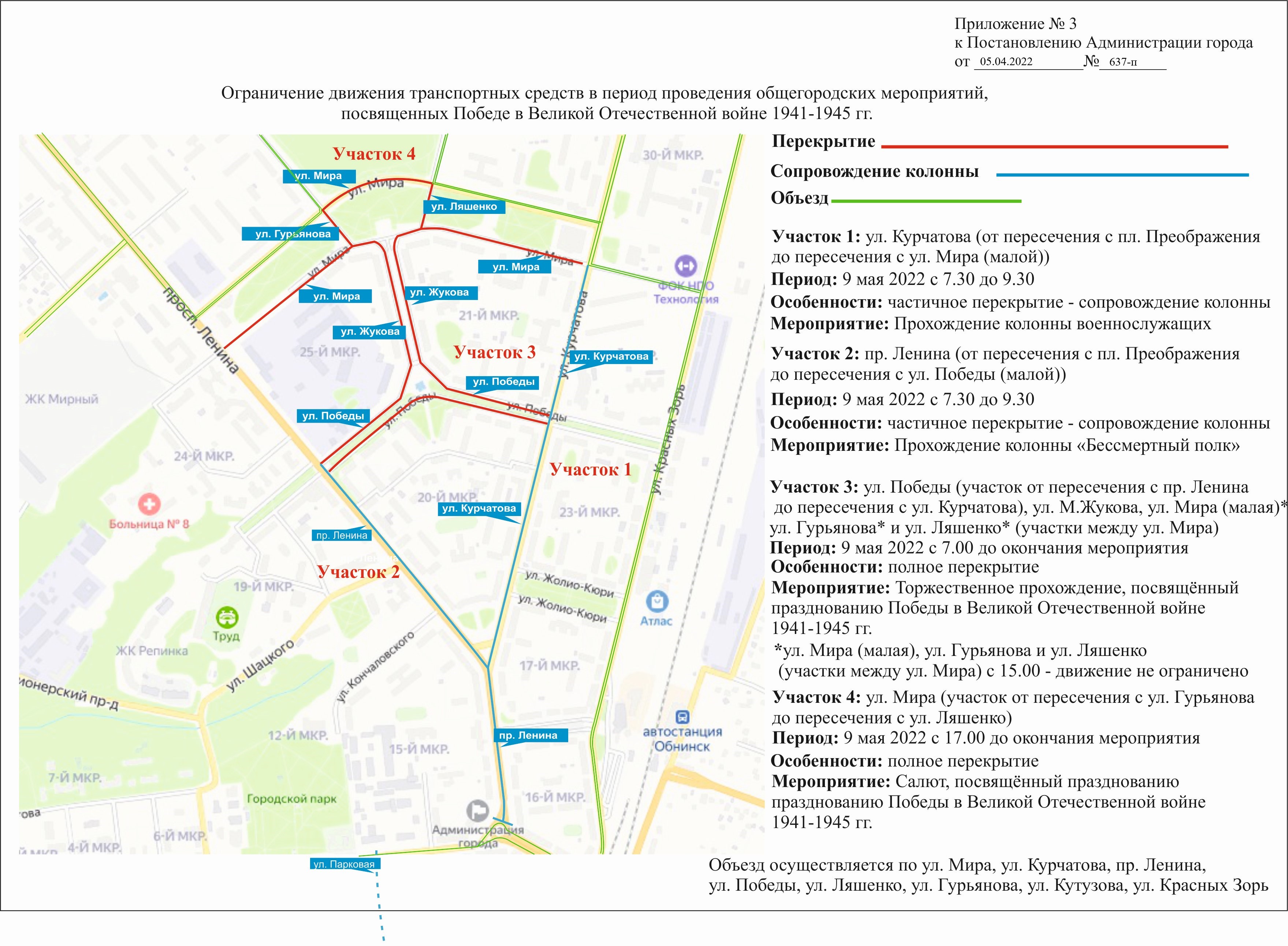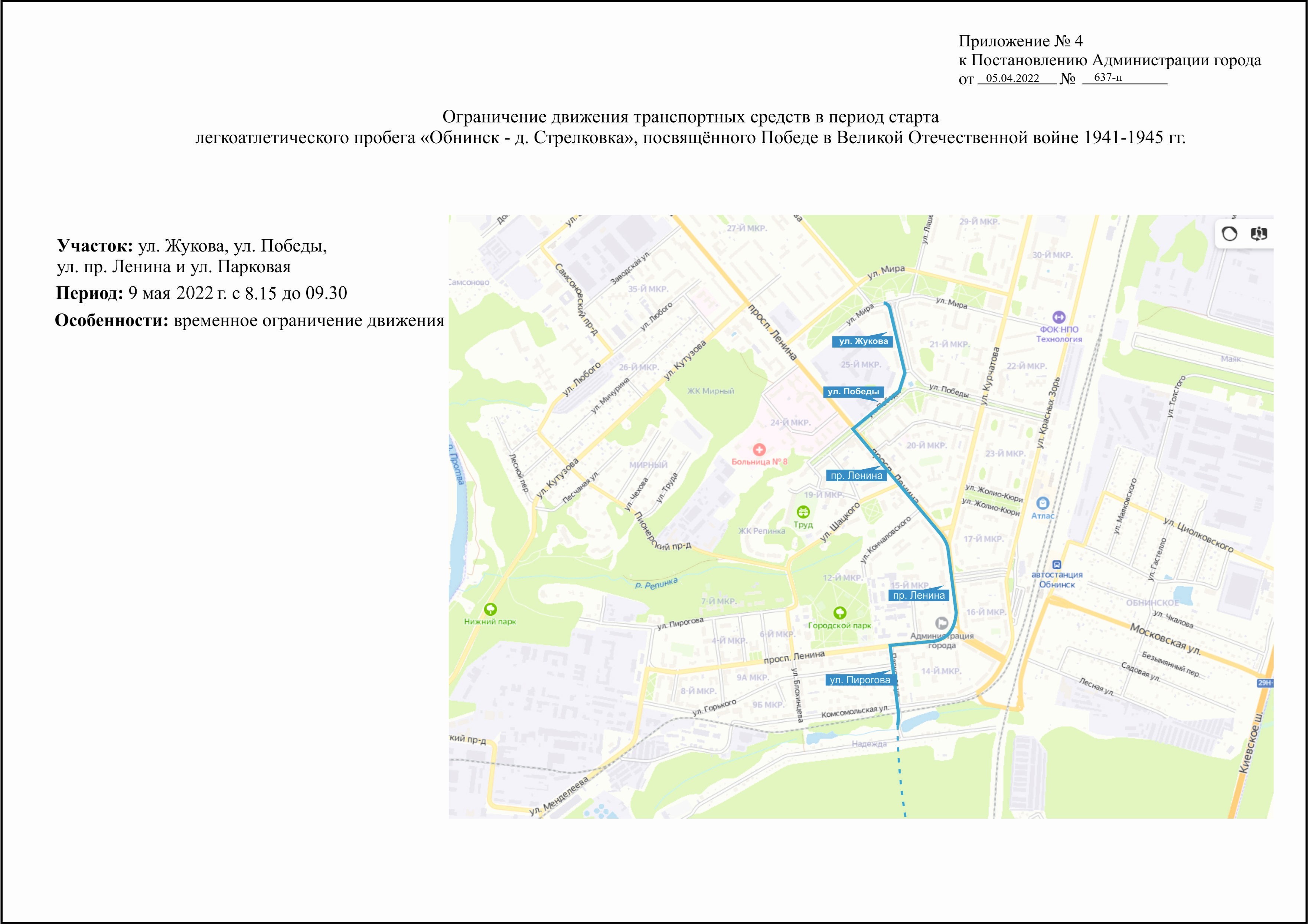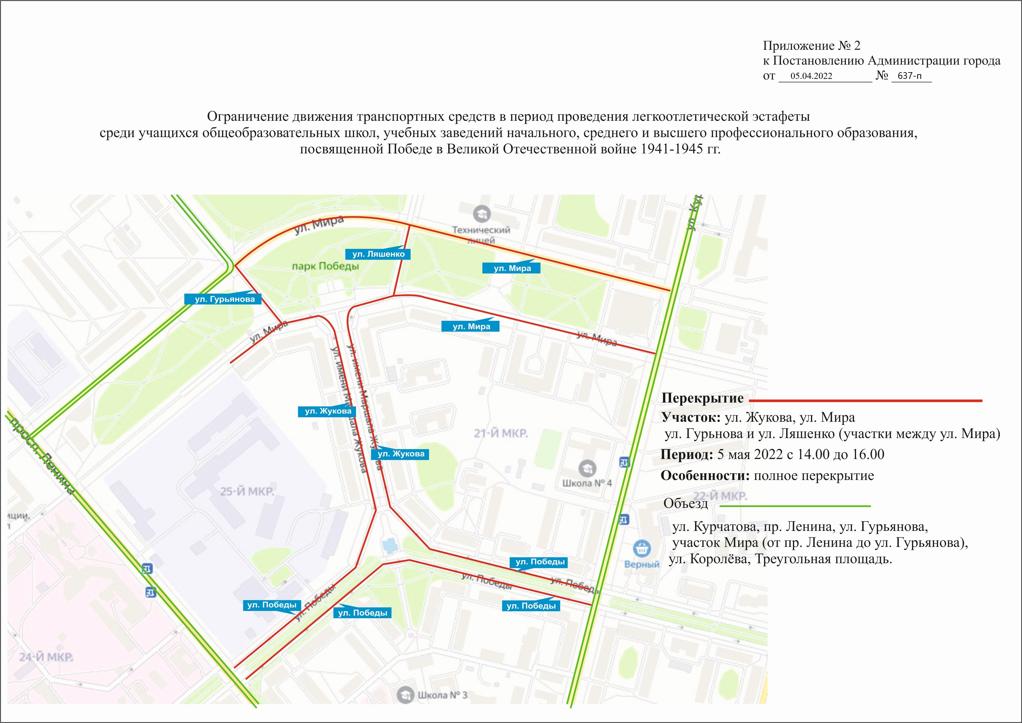 - 5 мая 2022 года с 14.00 до 16.00 часов на автомобильной дороге по ул. Маршала Жукова, на участке автомобильной дороги по ул. Победы (от пересечения с пр. Ленина до пересечения с ул. Курчатова), на участке автомобильной дороги по ул. Мира (от пересечения с ул. Курчатова до пересечения с ул. Гурьянова), на участке автомобильной дороги по ул. Ляшенко (между ул. Мира), на участке автомобильной дороги по ул. Гурьянова (между ул. Мира). (Приложение № 2);
