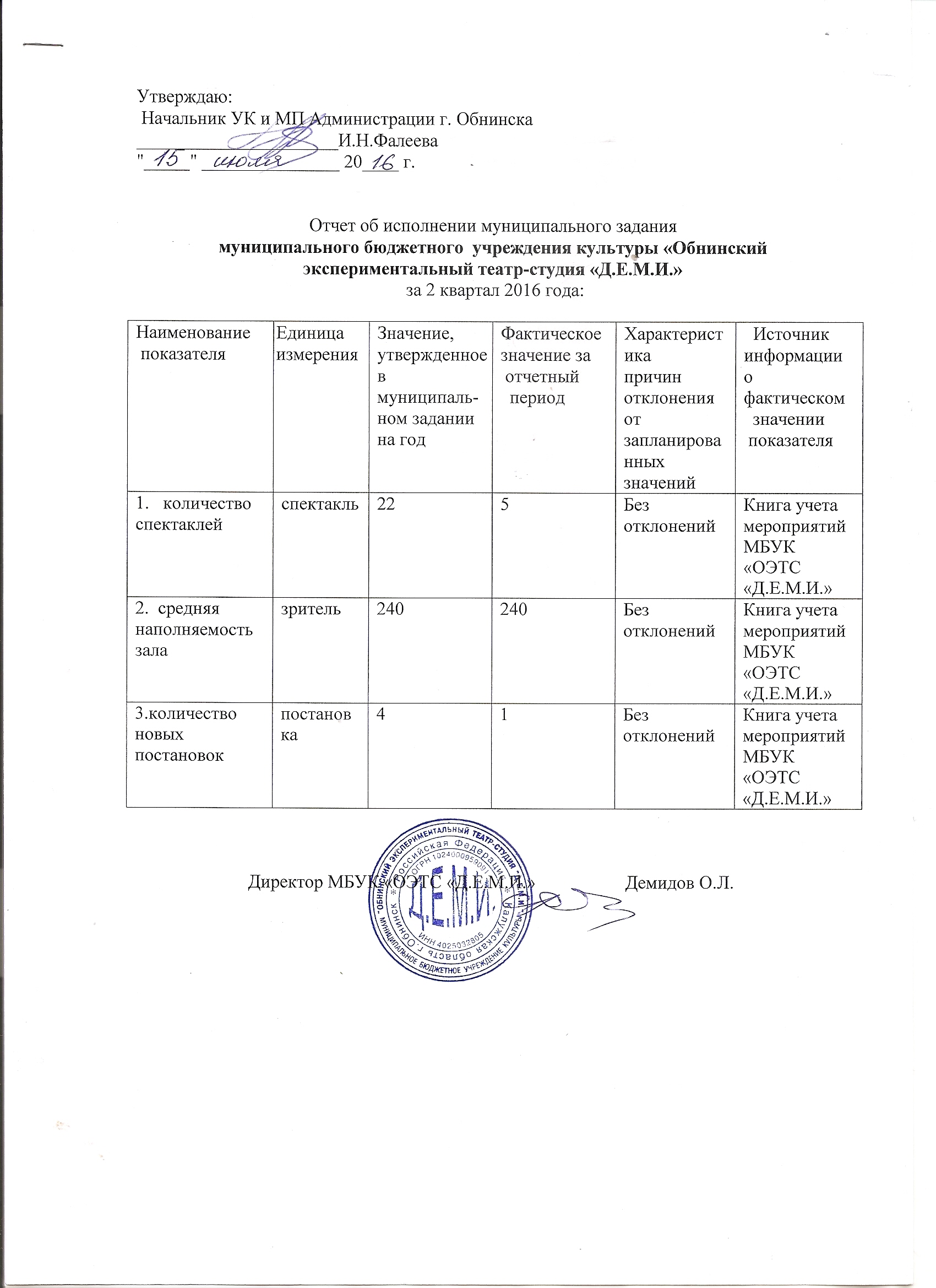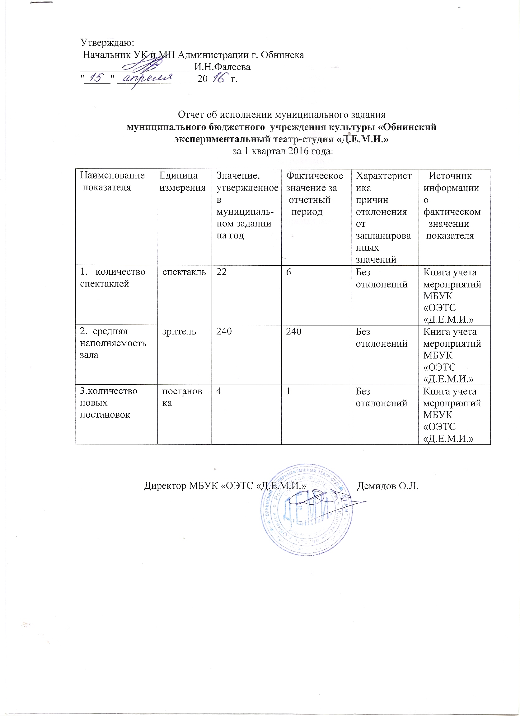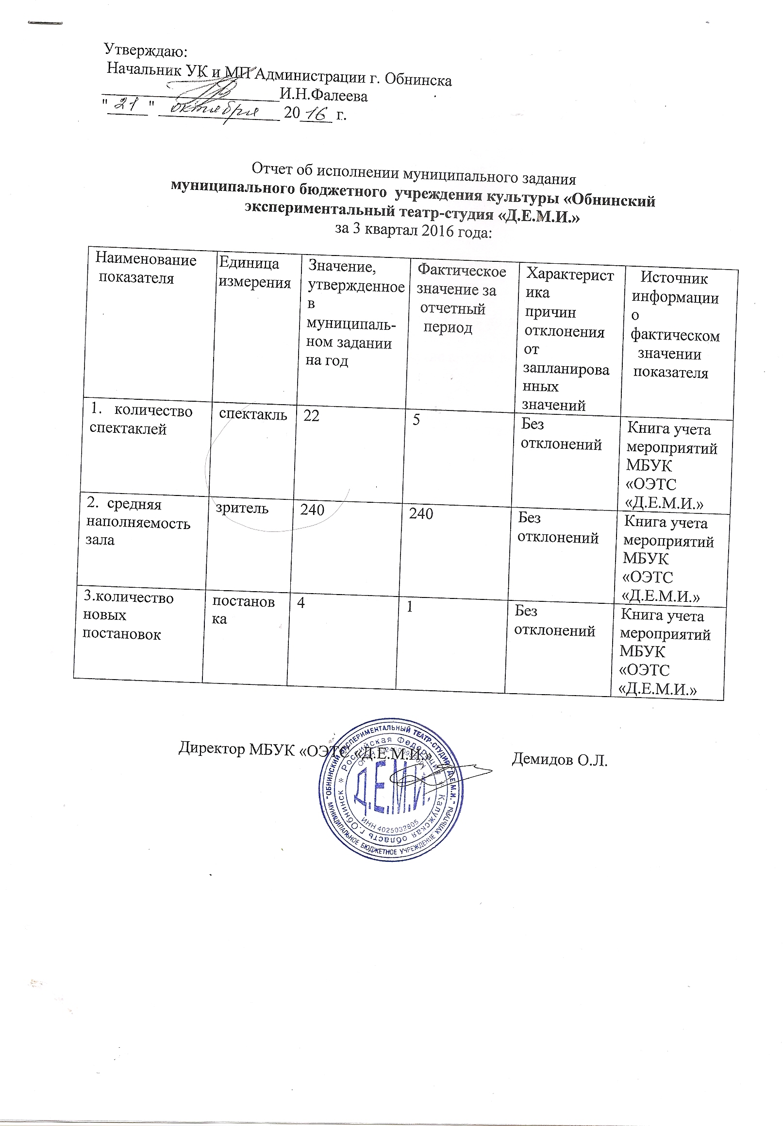 Муниципальное задание МБУК ОЭТС "Д.Е.М.И." на 2016 год