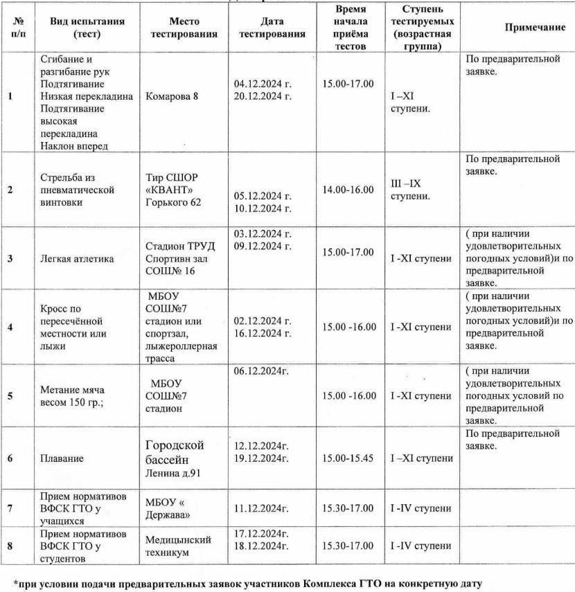 Сформирован план мероприятий МАУ ДО «СШОР «КВАНТ» по выполнению испытаний (тестов) и нормативов Всероссийского физкультурно-спортивного комплекса «Готов к труду и обороне» (ВФСК ГТО), а также по проведению физкультурно-спортивных мероприятий на декабрь 2024 года. В плане отражены даты проведения испытаний ГТО, виды нормативов, возрастные ступени участников.