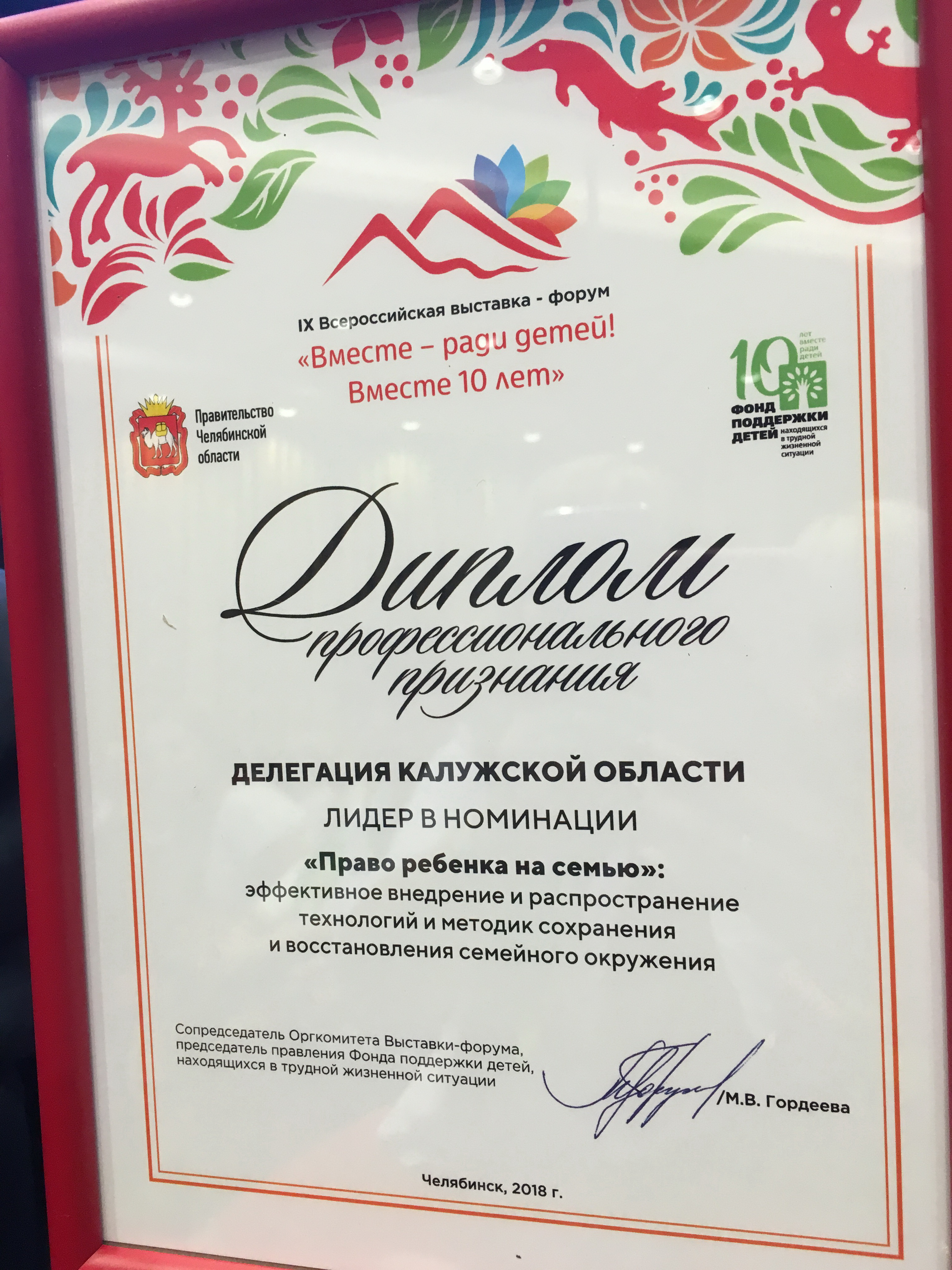 На закрытии форума подводились итоги работы. Делегация Калужской области была признана лидером в номинации «Право ребенка на семью»: эффективное внедрение и распространение технологий и методик сохранения и восстановления семейного окружения. Во многом благодаря тесному взаимодействию регионального правительства с Фондом в Калужской области создана и работает действенная система оказания помощи семьям с детьми. Участникам вручили сертификаты, а всей калужской делегации — диплом профессионального признания. Калужская область выбрана площадкой для проведения в 2019 году десятой, юбилейной, Всероссийской выставки-форума «Вместе ради детей!». Для региона это важное событие – принять в калужской области тех, кто все силы, знания, опыт отдает на благо будущего нашей России, кто посвятил себя важному делу – социальному служению детям.