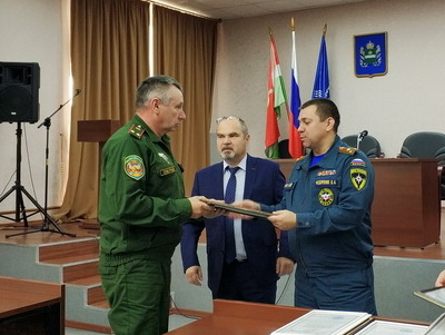 Заместитель главы Администрации города по вопросам городского хозяйства Вячеслав Лежнин и заместитель начальника Главного управления МЧС России по Калужской области - начальник управления гражданской защиты Виктор Федоренко в торжественной обстановке отметили тех, кто принимал участие в организации комплексных учений и вручили благодарственные письма.