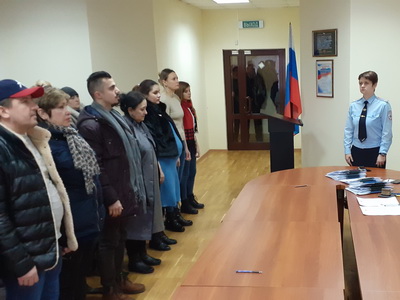 Информацию о порядке проведения принятия присяги довела начальник отдела по вопросам миграции подполковник полиции Наталья Максименко, а также представила присутствующего в зале представителя Общественного совета при ОМВД Владимира Ильина.