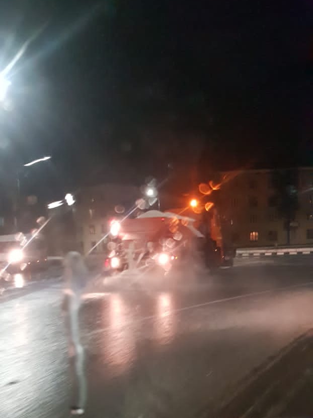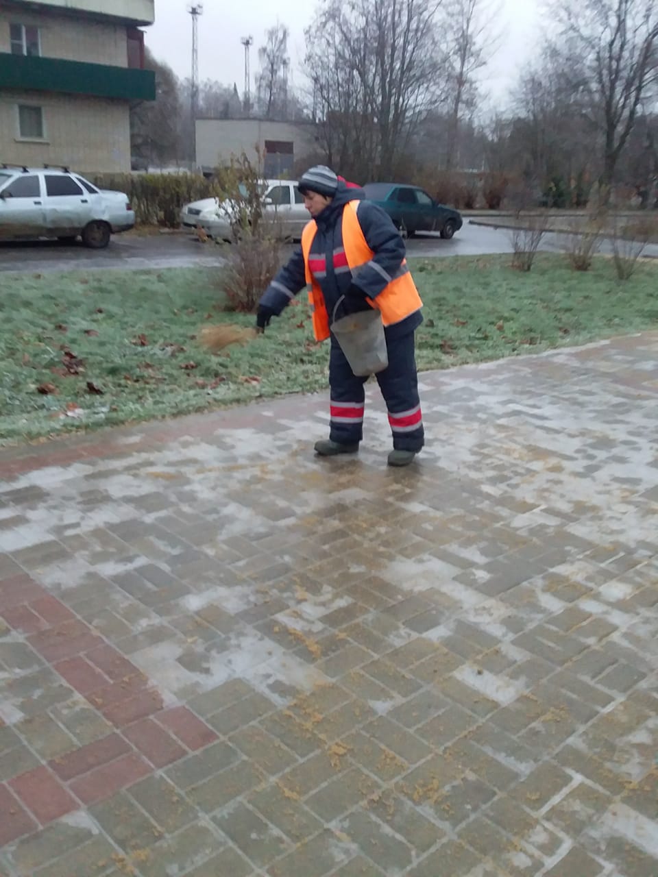Центральные автодороги продолжили обрабатывать пескосоляной смесью с 4-00 19 ноября, затем техника и рабочие перешли на обработку тротуаров.
