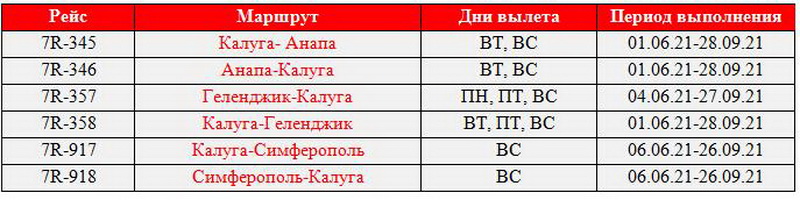 В летнем сезоне перевозчик свяжет Калугу с популярными курортами Крыма и Краснодарского края – Симферополем, Анапой и Геленджиком. Все рейсы будут выполняться на современных 50-ти кресельных канадских самолетах Bombardier CRJ-100/200 с начала июня по конец сентября 2021 года.