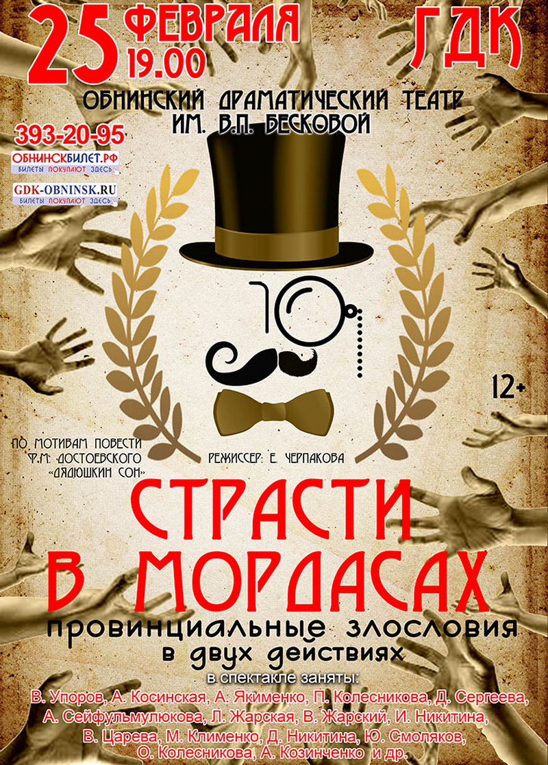 25 февраля в 19-00 в ГДК состоится спектакль «Страсти в Мордасах» по мотивам пьесы Ф. М. Достоевского «Дядюшкин сон», провинциальные злословия в двух действиях.