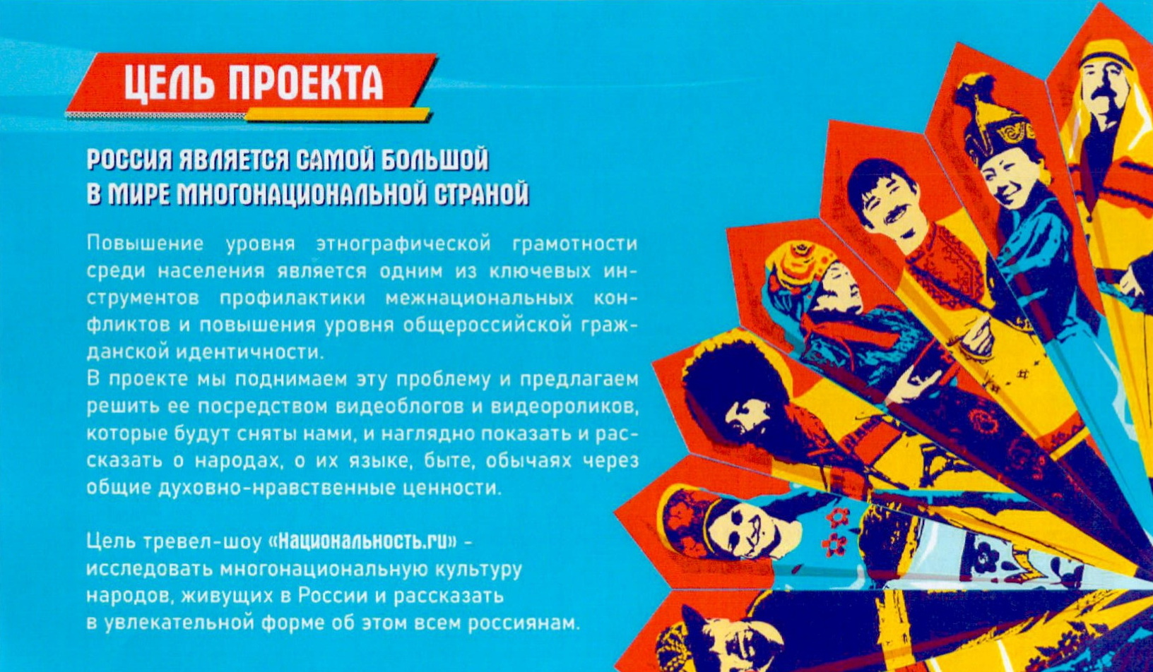 Проект реализуется второй год и предполагает создание видеороликов тревел-блога, в каждом из которых будут освещены традиции и культуры более 190 национальностей, проживающих на территории Российской Федерации.