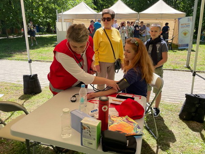 Специалисты региональной общественной организации «Российский Красный Крест» провели исследование крови на сахар, измерили давление и сатурацию, организовали мастер-классы по лечебной физкультуре и дыхательной гимнастике. Большую интерактивную программу по здоровому образу жизни подготовили обнинские волонтеры – медики: провели гимнастику и развивающие занятия с детьми, мастер-классы по суставной гимнастике и рассказали о питьевом режиме.