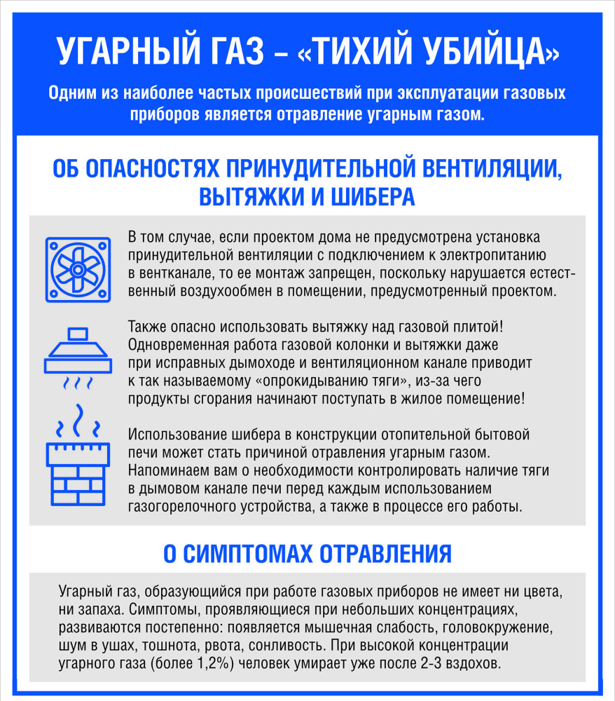 Не устраняйте самовольно неисправности в газовом оборудовании и на газопроводе, а отключите газ и вызовите специалиста. Во время работы газовых приборов следите за вентиляцией кухни: приоткрывайте форточки на все время горения газа, не закрывайте решетки вентиляционных каналов. Проверяйте тягу до включения и во время работы газовых приборов с отводом продуктов сгорания в дымоход.