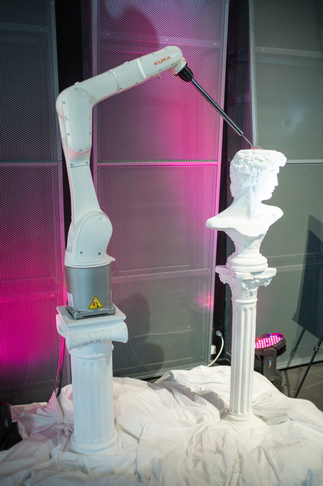 Особое внимание гостей привлекла инсталляция The Glitcher: бюст философа с внутренней полостью, заполненной мерцающим слаймом, который перемешивает робот-манипулятор. По словам авторов работы, она создана для наблюдения за мыслительным процессом и открыта для свободной интерпретации каждым зрителем.