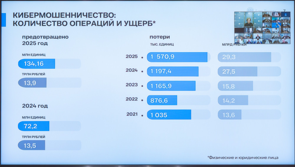Банк России за 2025 год направил информацию об 1 тыс ресурсов с целью последующего снятия их с делегирования. Это на 23% меньше, чем в 2024 году. Общее количество ресурсов, к которым был ограничен доступ, составило 37,4 тыс единиц, что на 16% меньше, чем в позапрошлом году. За 2025 год банки отразили 134 млн попыток злоумышленников похитить средства со счетов клиентов финансовых организаций. Благодаря внедрённым механизмам удалось предотвратить хищения на общую сумму 14 трлн рублей.