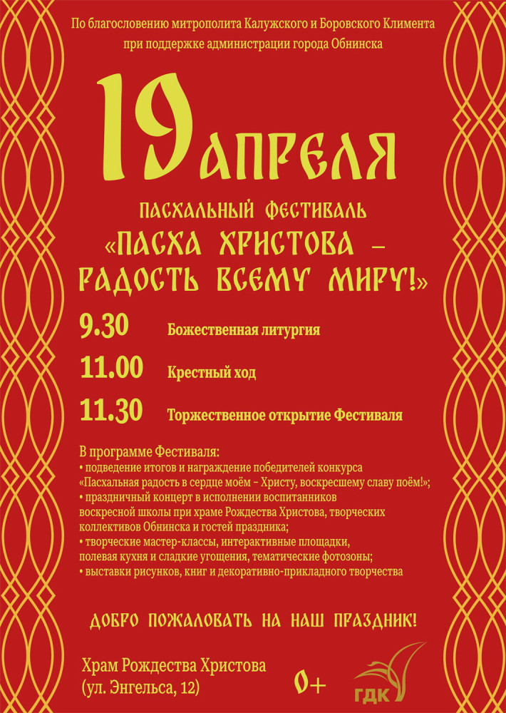 19 апреля 2026 года на территории храма Рождества Христова (ул. Энгельса, 12) состоится Пасхальный фестиваль «Пасха Христова – радость всему миру!». Мероприятие проводится по благословению митрополита Калужского и Боровского Климента при поддержке администрации города Обнинска.