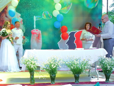В этом году торжественная регистрация заключения брака проходила на площадке Городского парка в Старом городе. Две пары молодых обнинцев изъявили желание провести церемонию бракосочетания на открытом воздухе. Место проведения церемонии было празднично украшено живыми букетами ромашек - символом праздника, воздушными шарами цветов флага России. Звучала музыка и рассказ об истории праздника.
