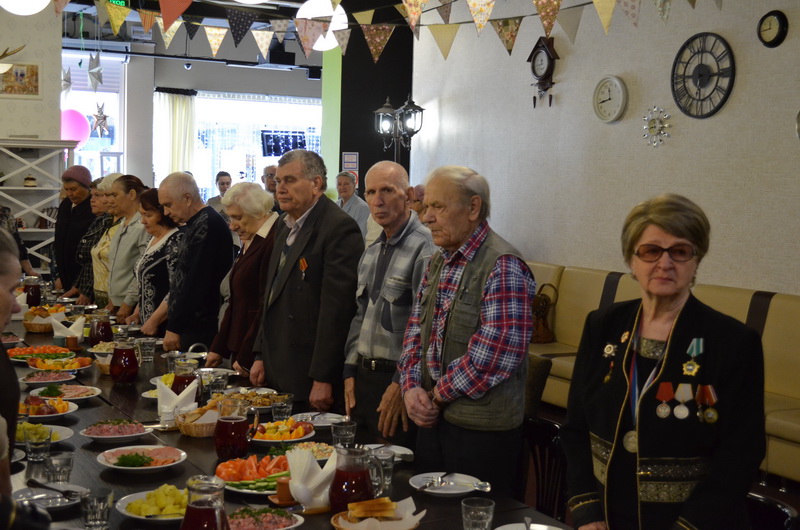 После возложения цветов и минуты молчания ветеранов организованно отвезли в боулинг-центр "Атом", где для них был накрыт стол и подготовлена большая концертная программа.