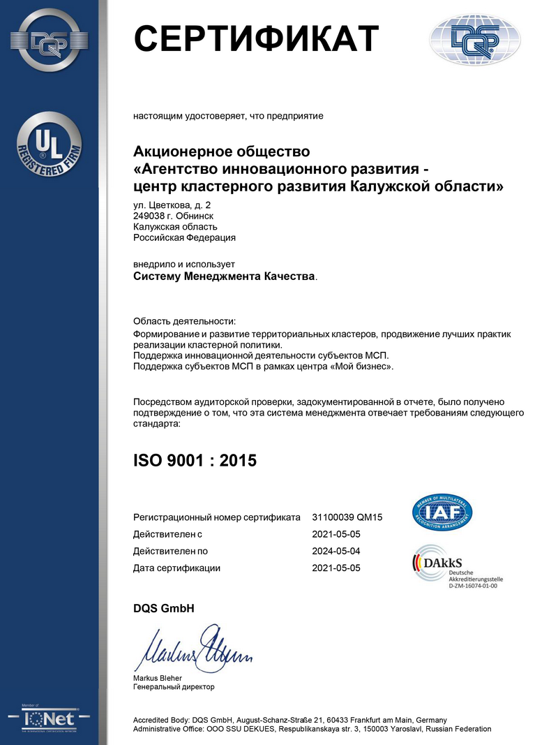 Основным средством для достижения поставленных целей является система менеджмента качества, соответствующая требованиям международного стандарта ISO 9001:2015. Система менеджмента качества Агентства инновационного развития, которая охватывает основные виды его деятельности, и в которую вовлечен весь его персонал, сертифицирована по международному стандарту ISO 9001:2015.