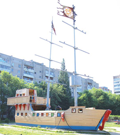 Одним из членов его команды был Владимир Шкарпетин, ныне здравствующий известный архитектор. Если подойти к кораблю во дворе 40а мкр. и внимательно посмотреть на кованые флаги, «развевающиеся» на мачтах, то увидите там буквы. Буква «Ш» — значит, Шкарпетин, один из авторов, — именно он и придумал, чтобы во дворе стояли корабль и крепость. А получилось так: сначала на бумаге в центре двора возник фигурный бассейн, потом появилась мысль — а не дополнить ли композицию? Так на берегу «моря» появились корабль и крепость. Корабль — не барк, не бригантина, не каравелла — это просто стилизация под европейское океанское судно начала Нового времени. По размерам примерно такое же, как тогда — корабли Колумба были не больше. Диковинный двор стал местом паломничества детворы со всего города и округи — таких «игрушек» нигде больше не было. Со временем они, увы, поизносились, да и «добрые люди» растащили все, что могли — крепость лишилась деревянных пушек, корабль остался без двух фонарей, висевших у входа на корму, но даже в нынешнем не очень презентабельном виде корабль с крепостью остаются украшением города.