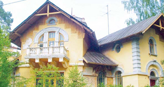 Самым же красивым зданием Обнинска в 40-е годы, впрочем, как и в последующие десятилетия, можно считать особняк Виктора Обнинского, построенный в 1901-02 гг., который традиционно в городе именуется по фамилии следующей владелицы — Морозовская дача. Красавец-дом был сооружен влюбленным человеком, Виктор Петрович только что женился и к своей юной супруге относился трепетно и нежно. И особняк, легкий и устремленный в небо, подчеркивал это чувство. Дом “держала” вертикаль — 8-метровая башня, опоясанная балконом. Сейчас этой башни нет, ее снесли весной 1942-го в целях маскировки — в здании расположился командный пункт командующего Западным фронтом.
