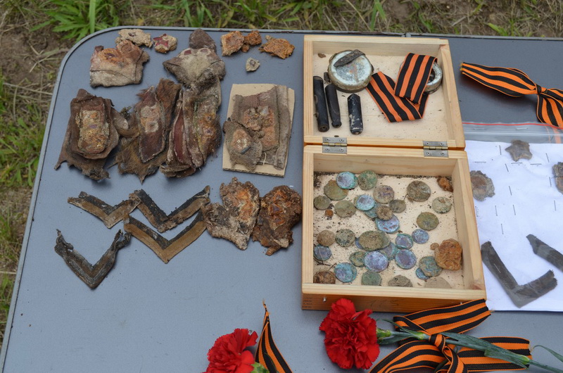 Прочитаны вкладыши из найденных солдатских медальонов (В.М. Тульский , С.И. Корочкин ,Н.И.Лаптев). Родственники установлены.Так же на солдатском котелке и крышке установлена фамилия (Хатаров) .