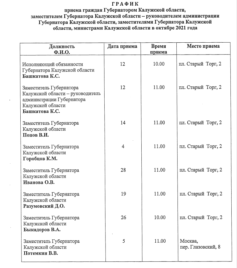 График приема граждан Губернатором Калужской области, заместителем Губернатора Калужской области -руководителем администрации Губернатора Калужской области, министрами Калужской области в октябре 2021г.
