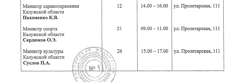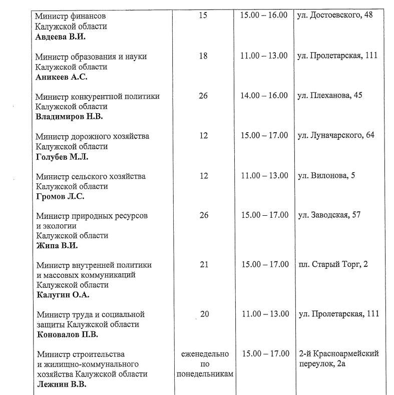 • График приема граждан Губернатором Калужской области, заместителем Губернатора Калужской области -руководителем администрации Губернатора Калужской области, министрами Калужской области в октябре 2021г.