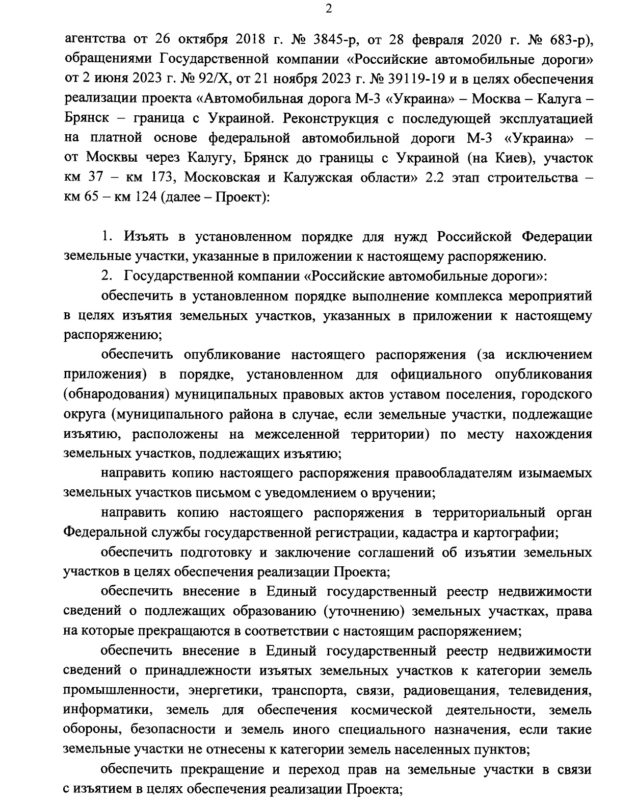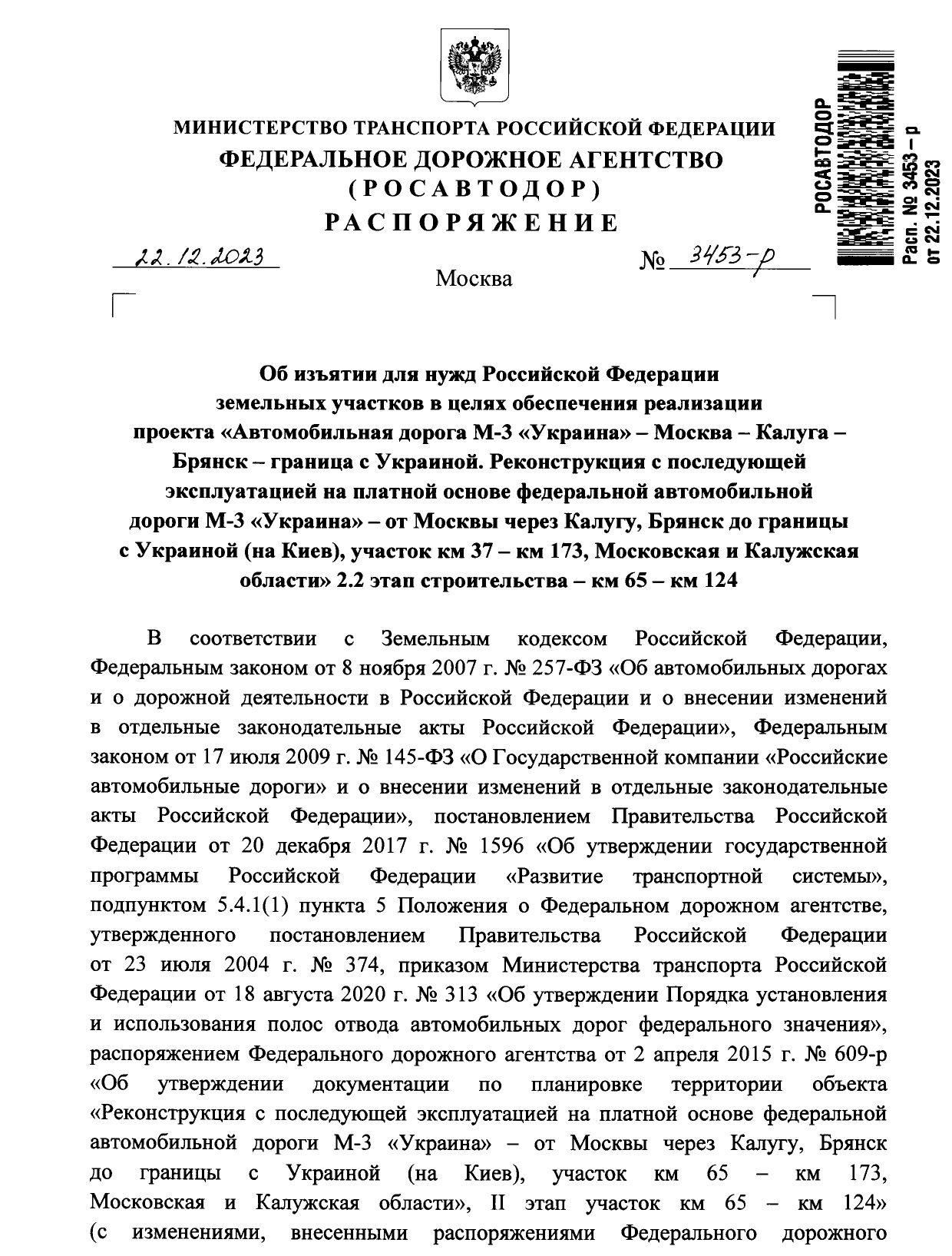 Распоряжение Федерального дорожного агентства от 22.12.2023 № 3453-р «Об изъятии для нужд Российской Федерации земельных участков в целях обеспечения реализации проекта «Автомобильная дорога М-3 «Украина» -Москва-Калуга-Брянск-граница с Украиной. Реконструкция с последующей эксплуатацией на платной основе федеральной автомобильной дороги М-3 «Украина» - от Москвы через Калугу, Брянск до границы с Украиной (на Киев), участок км 37 – км 173, Московская и Калужская области» 2.2 этап строительства – км 65 – км 124»