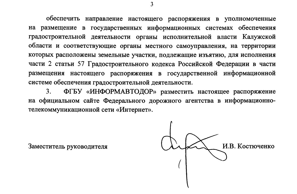 • Распоряжение Федерального дорожного агентства от 22.12.2023 № 3453-р «Об изъятии для нужд Российской Федерации земельных участков в целях обеспечения реализации проекта «Автомобильная дорога М-3 «Украина» -Москва-Калуга-Брянск-граница с Украиной. Реконструкция с последующей эксплуатацией на платной основе федеральной автомобильной дороги М-3 «Украина» - от Москвы через Калугу, Брянск до границы с Украиной (на Киев), участок км 37 – км 173, Московская и Калужская области» 2.2 этап строительства – км 65 – км 124»