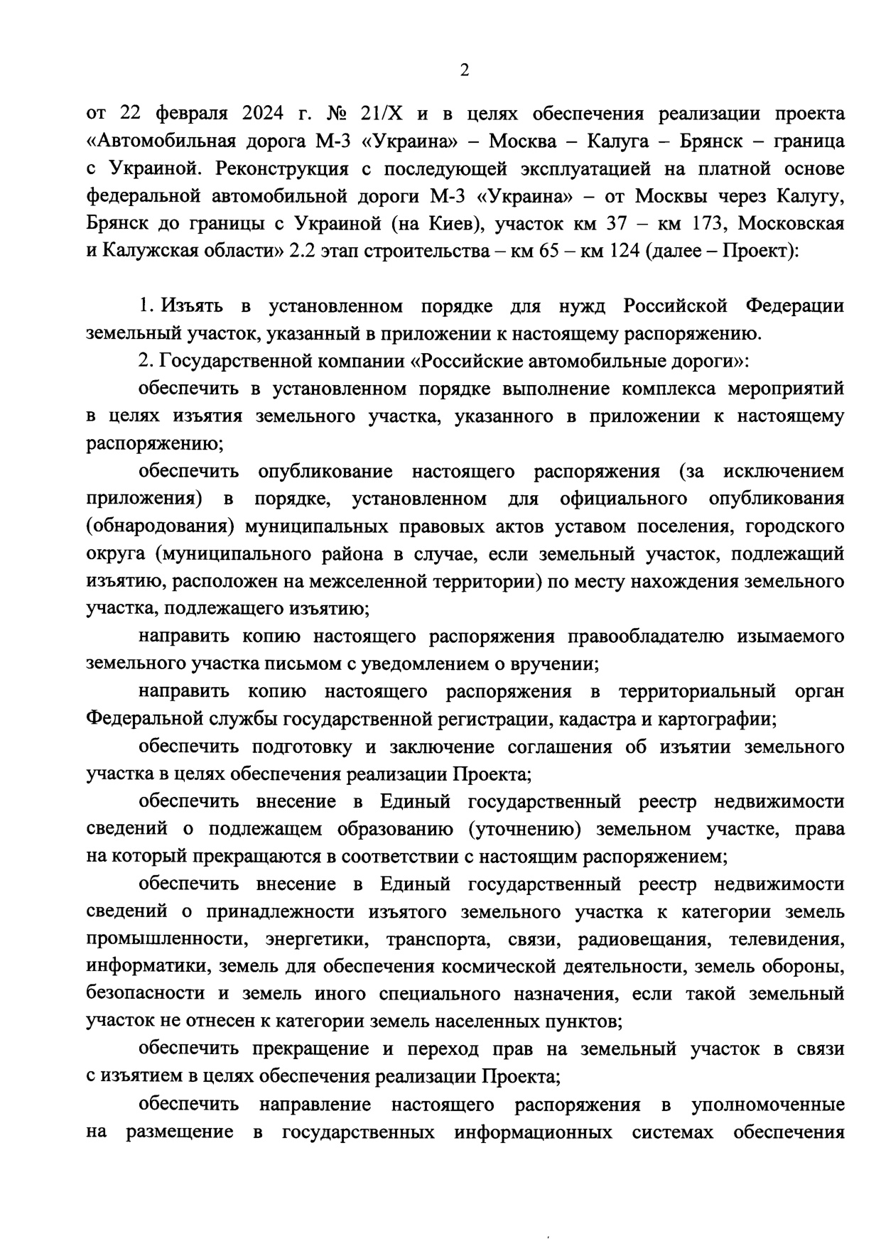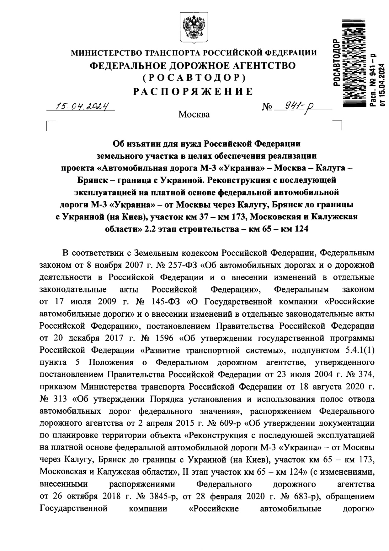 Распоряжение Министерства транспорта РФ Федерального дорожного агентства (РОСАВТОДОР) от 15.04.2024 № 941-р «Об изъятии для нужд Российской Федерации земельного участка в целях обеспечения реализации проекта «Автомобильная дорога М-3 «Украина»-Москва-Калуга-Брянск-граница с Украиной. Реконструкция с последующей эксплуатацией на платной основе федеральной автомобильной дороги М-3 «Украина» - от Москвы через Калугу, Брянск до границы с Украиной (на Киев), участок км 37 - км 173, Московская и Калужская области» 2.2 этап строительства – км 65 – км 124»