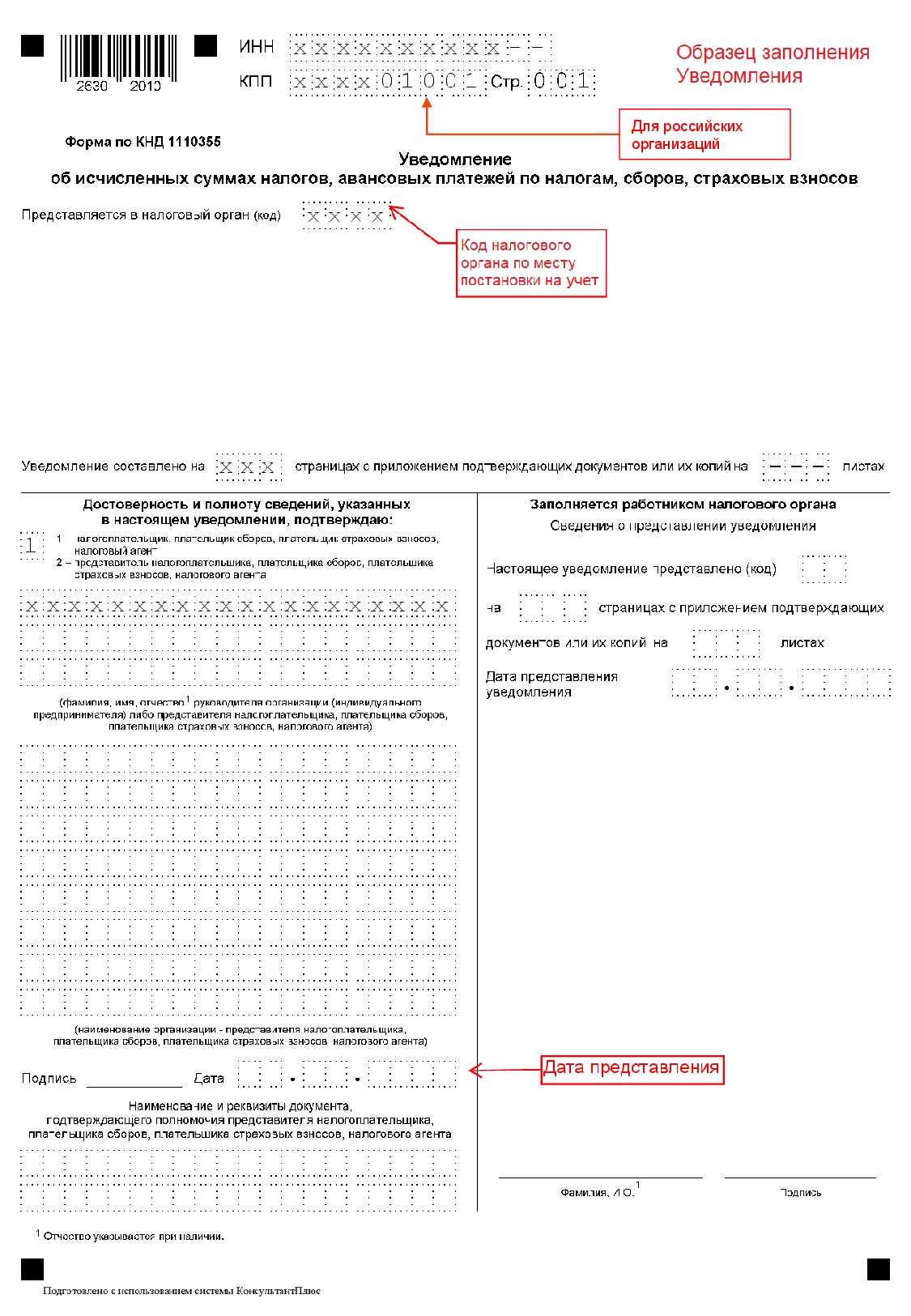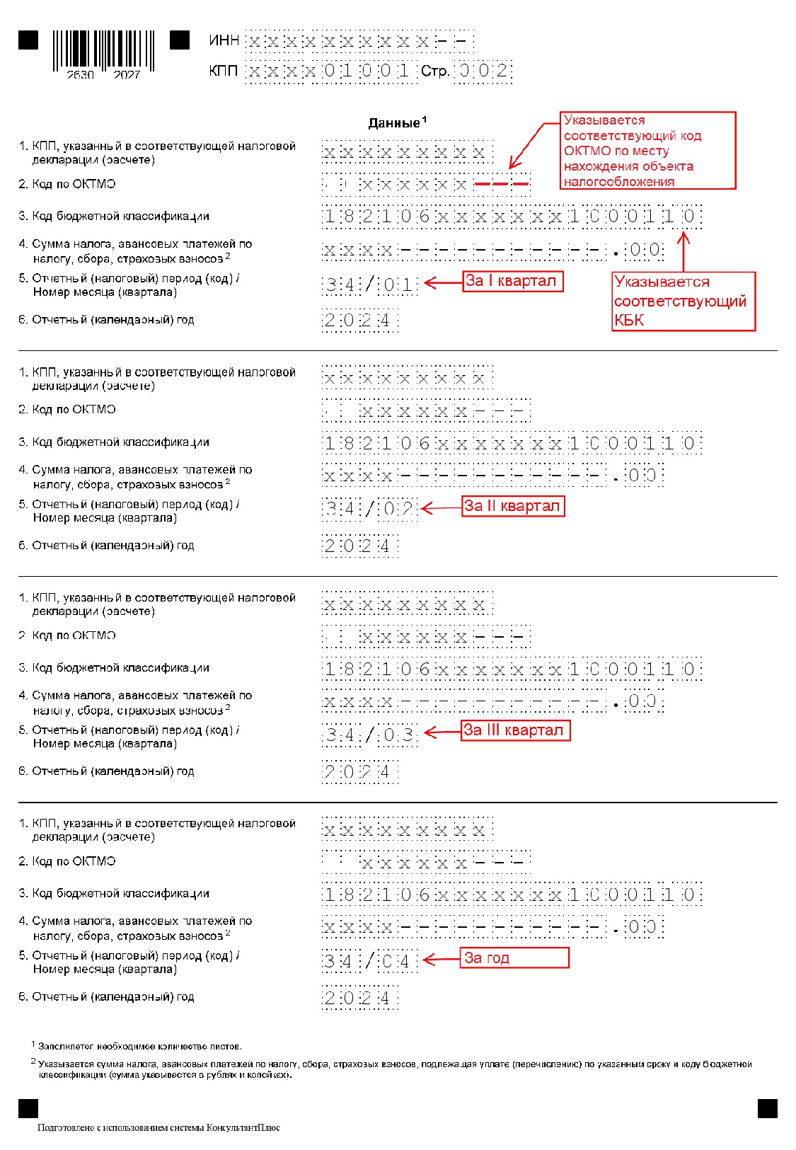 В одном уведомлении можно указать несколько отчетных (налоговых) периодов и несколько налогов (заполните несколько отдельных блоков строк 1 – 6). Суммы в уведомлении отражаются за каждый конкретный отчетный период, а не нарастающим итогом.